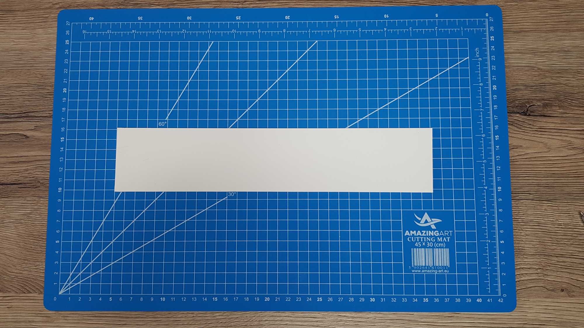 - Najpierw wykonamy box na kafelki. W tym celu należy wyciąć jego podstawę o wymiarach 31 cm/9 cm. Linijką i ołówkiem wyznaczamy linię prostą dla każdego z czterech boków prostokąta. Następnie nożem wykonujemy pierwsze delikatne nacięcie w piance, aby rozciąć materiał. Dopiero powtarzając tę czynność drugi raz, przecinamy piankę na dwa kawałki. Jest to dość istotne, ponieważ w ten sposób niwelujemy ryzyko postrzępienia krawędzi.