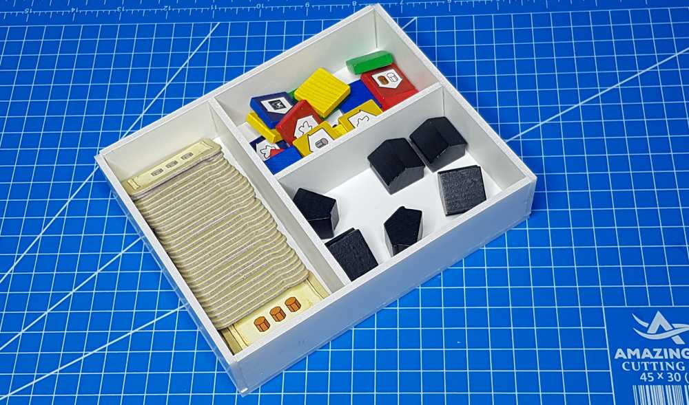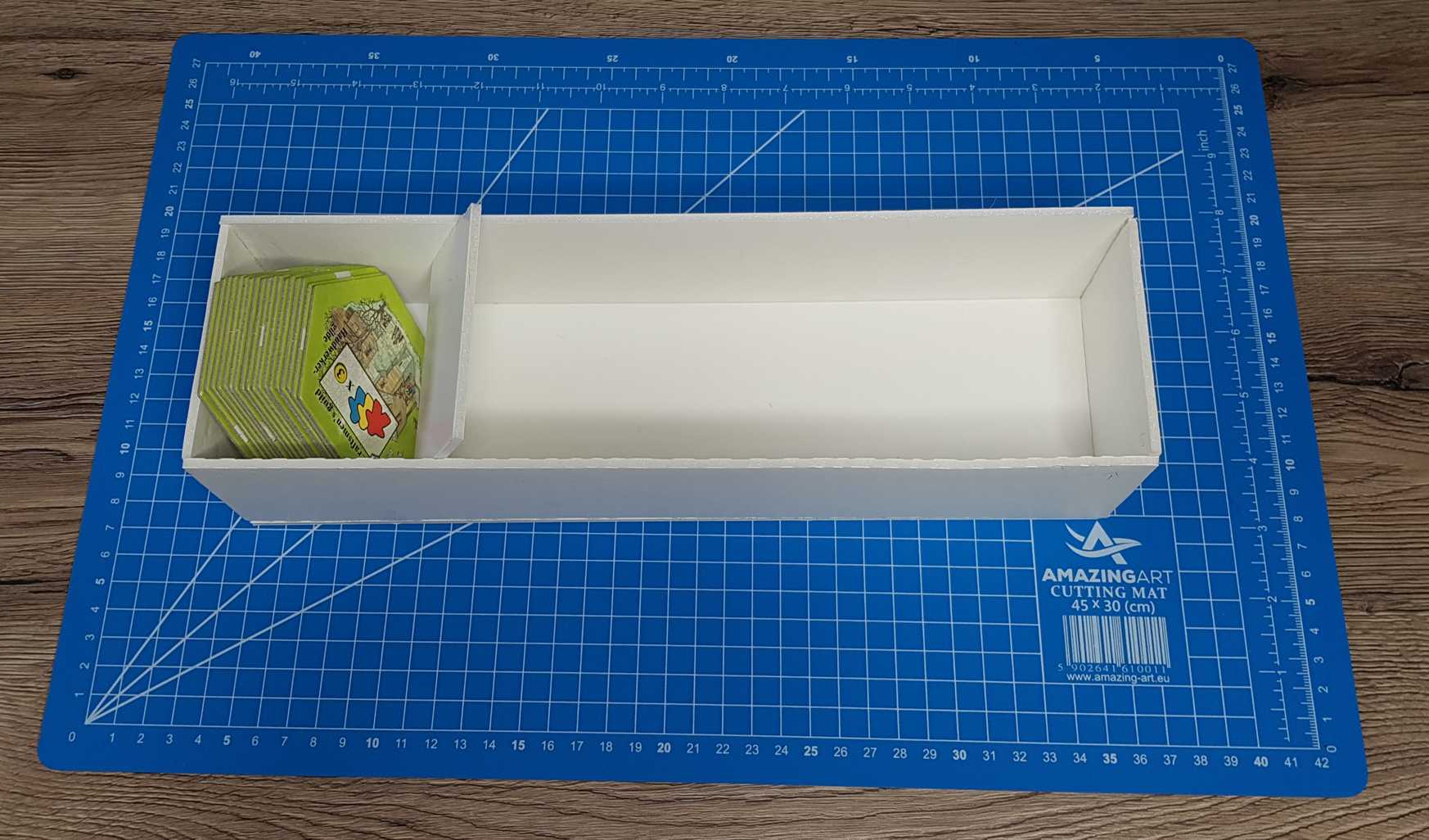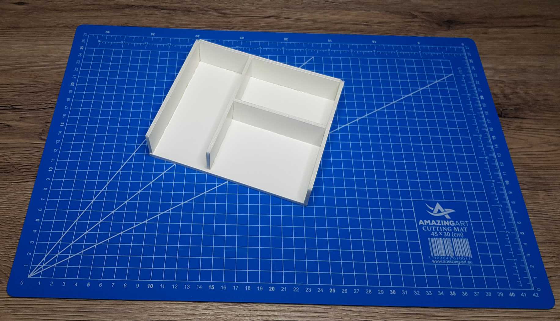 Gotowe ścianki wewnętrzne Wyznaczenie środka boxu Gotowy insert na elementy z dodatku Farmerzy - Ostatni box przeznaczymy na kontrakty, żetony usprawnień oraz chaty z dodatku Kupcy. Tutaj potrzebujemy tylko trzech przegródek, dlatego wycinamy jedną ściankę o wymiarach 11,9 cm długości/3 cm wysokości oraz jedną ściankę o wymiarach 9 cm długości/3 cm wysokości. Tutaj najpierw przykleimy ściankę krótszą, a następnie dołączymy dłuższą, dzięki czemu kontrakty zmieszczą się idealnie. Pozostała nam do przyklejenia ostatni ścianka zewnętrzna i gotowe!