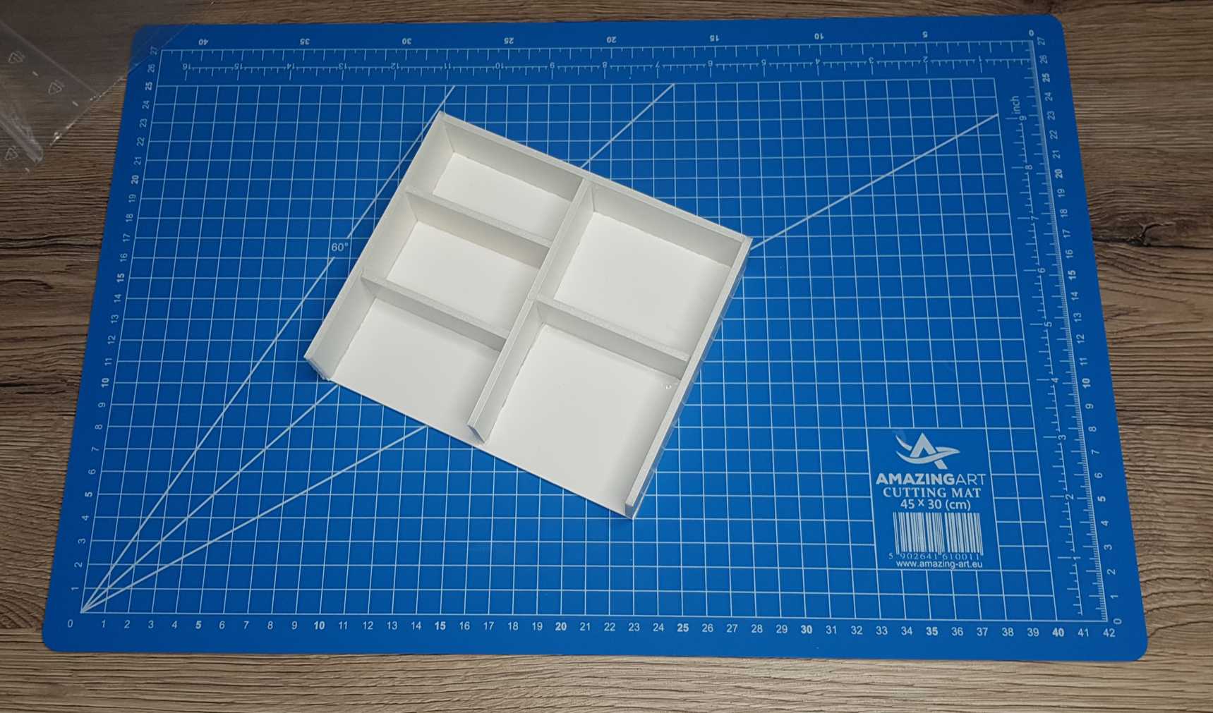 - Pora na wycięcie ścianek separujących kafelki. Płytki podzieliłam na zimę, jesień, lato, wiosnę oraz kafle startowe, czyli przygotowujemy 4 ścianki o wymiarach 8,3 cm długości/5 cm wysokości. Niższe ścianki wewnętrzne ułatwią dostęp do elementów. Gdy ścianki mamy już gotowe, musimy odpowiednio ułożyć je w gotowym boxie. Przyznam, że była to najtrudniejsza część całego przedsięwzięcia, ponieważ kafle musiały zostać ułożone pod odpowiednim kątem, aby można było swobodnie zamknąć wieko gry. W moim insercie przestrzeń na dane kafelki wygląda tak: