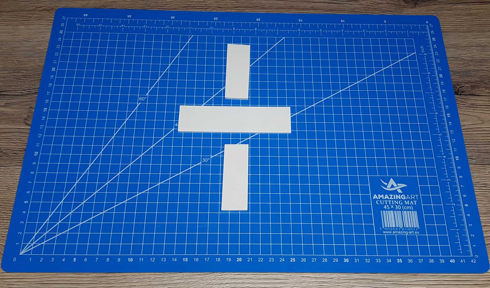 - Następnie w ten sam sposób wycinamy ścianki naszego boxa. Dwie dłuższe mają wymiary 31 cm długości/6,3 cm wysokości, natomiast dwie krótsze to 8,3 cm długości/6,3 cm wysokości. Jak widzicie, przy krótszej ściance została uwzględniona grubość pianki 3 mm, dlatego wymiar jest pomniejszony o 6 mm.