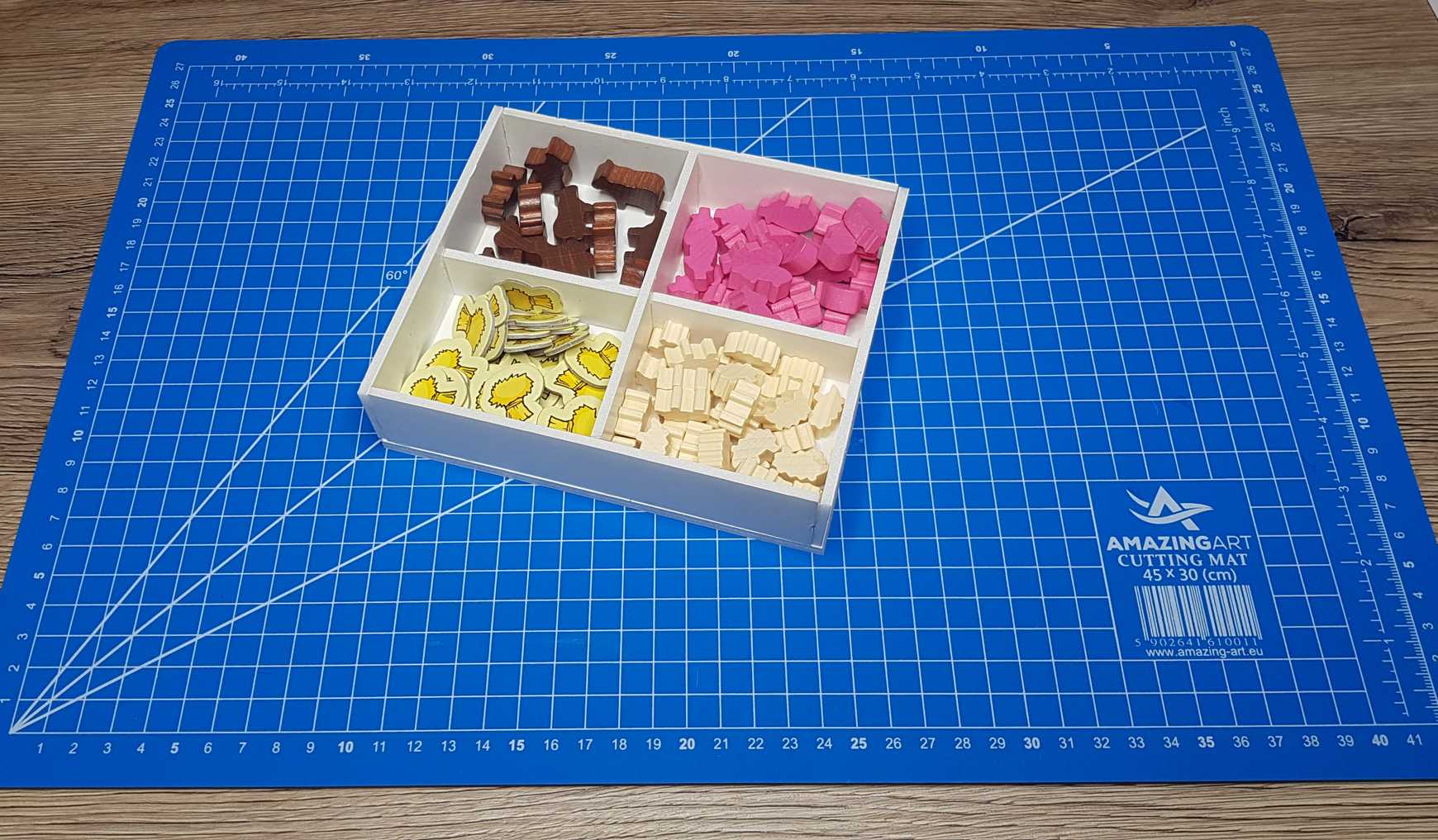Ułożenie separatorów wewnętrznych Gotowy insert na elementy z podstawowej wersji gry - Teraz pora na box dla trzech rodzajów drewnianych zwierzątek oraz żetonów pszenicy z dodatku Farmerzy. Potrzebujemy jednego separatora o wymiarach 11,9 cm długości/3 cm wysokości oraz dwóch ścianek o wymiarach 7 cm długości/2,5 cm wysokości. Zmniejszyłam wysokość, aby uzyskać ciekawszy efekt, natomiast jest to zabieg bardzo opcjonalny. Ścianki przyklejamy w taki sposób, aby stworzyć 4 przegródki takiej samej wielkości. Na koniec również doklejamy brakującą ściankę zewnętrzną.