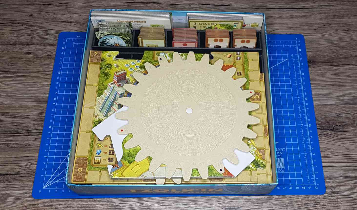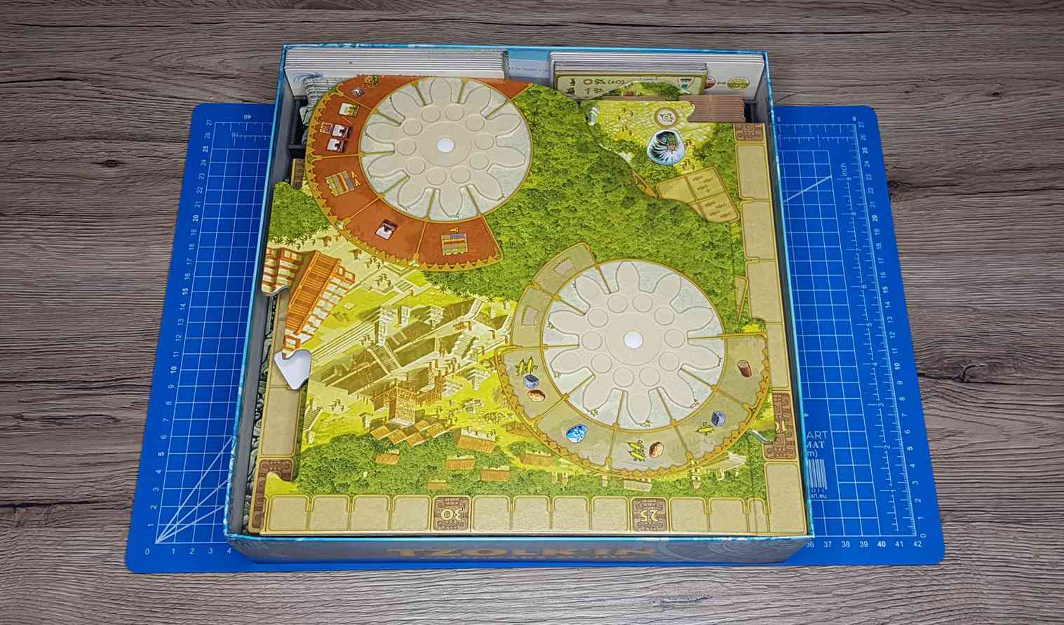 W przypadku Tzolk’ina ważne jest również ułożenie elementów planszy w odpowiedniej kolejności. Ja zawsze zaczynam od tych kawałków, które nie mają na sobie kół. Na samej górze ustawiam największy fragment, na którym znajdują się aż dwa koła. Jest on znacznie większy od pozostałych i przykrywa również część insteru z kartonikami, dlatego nie ma możliwości ułożenia go niżej. Jednak taka kolejność zapobiega przemieszczaniu się elementów i pozwala w pełni cieszyć się porządkiem w pudełku.