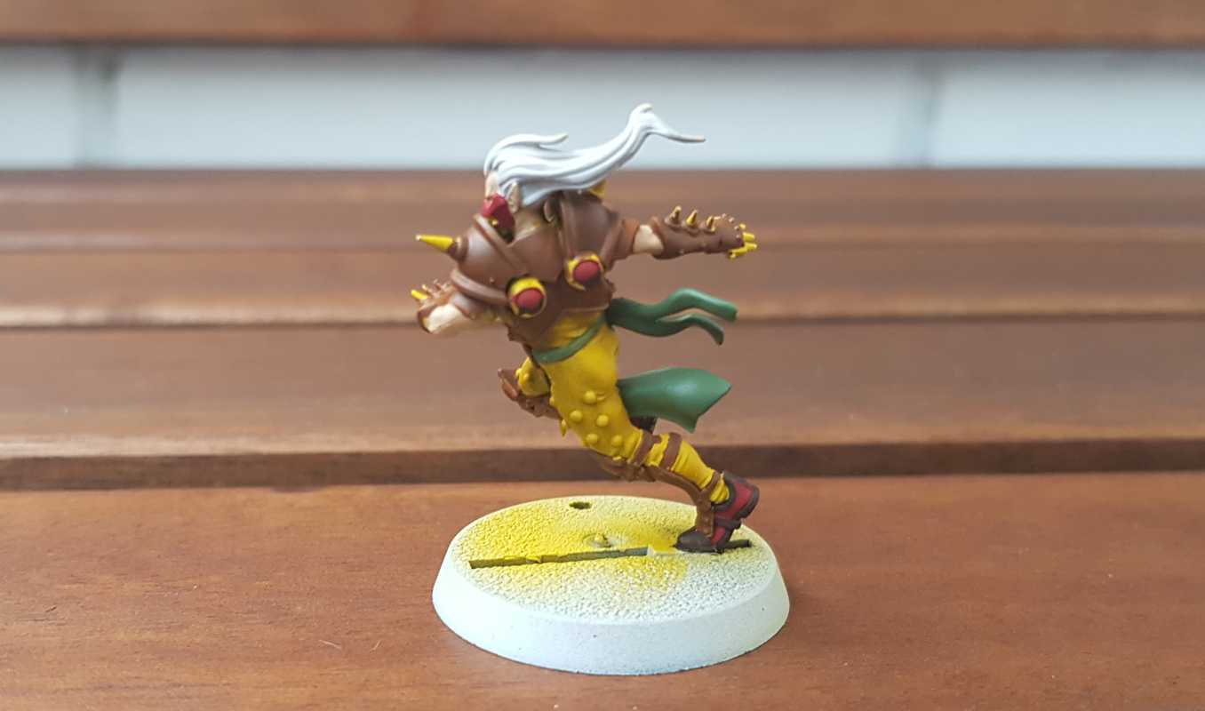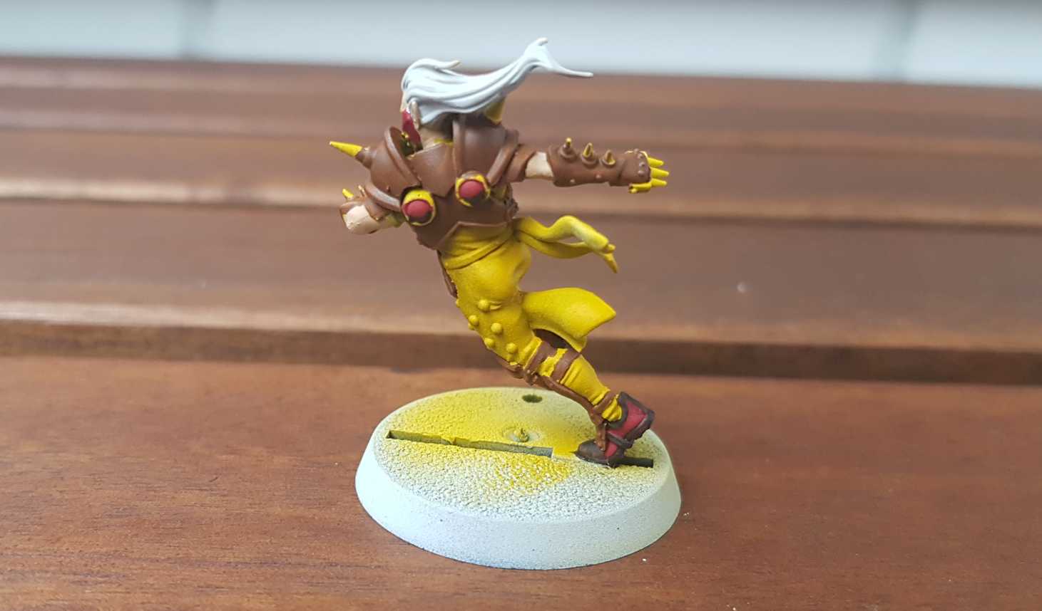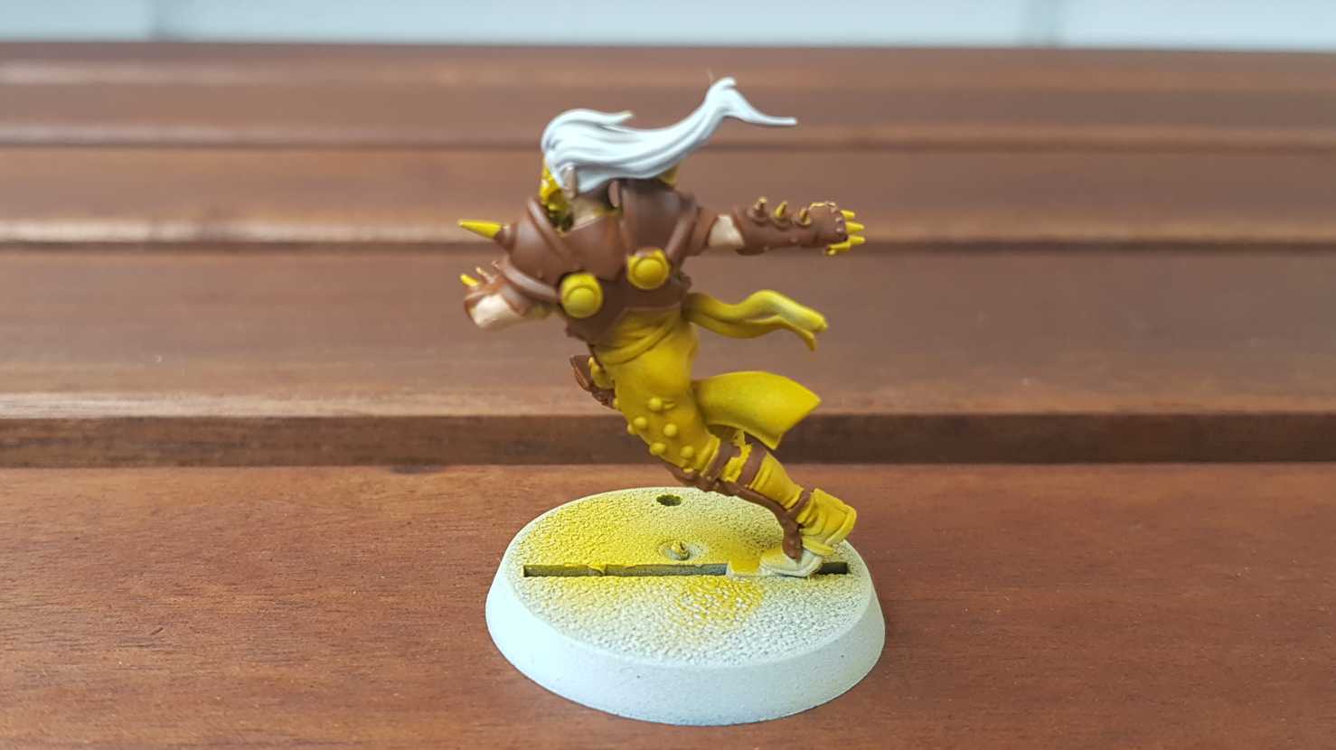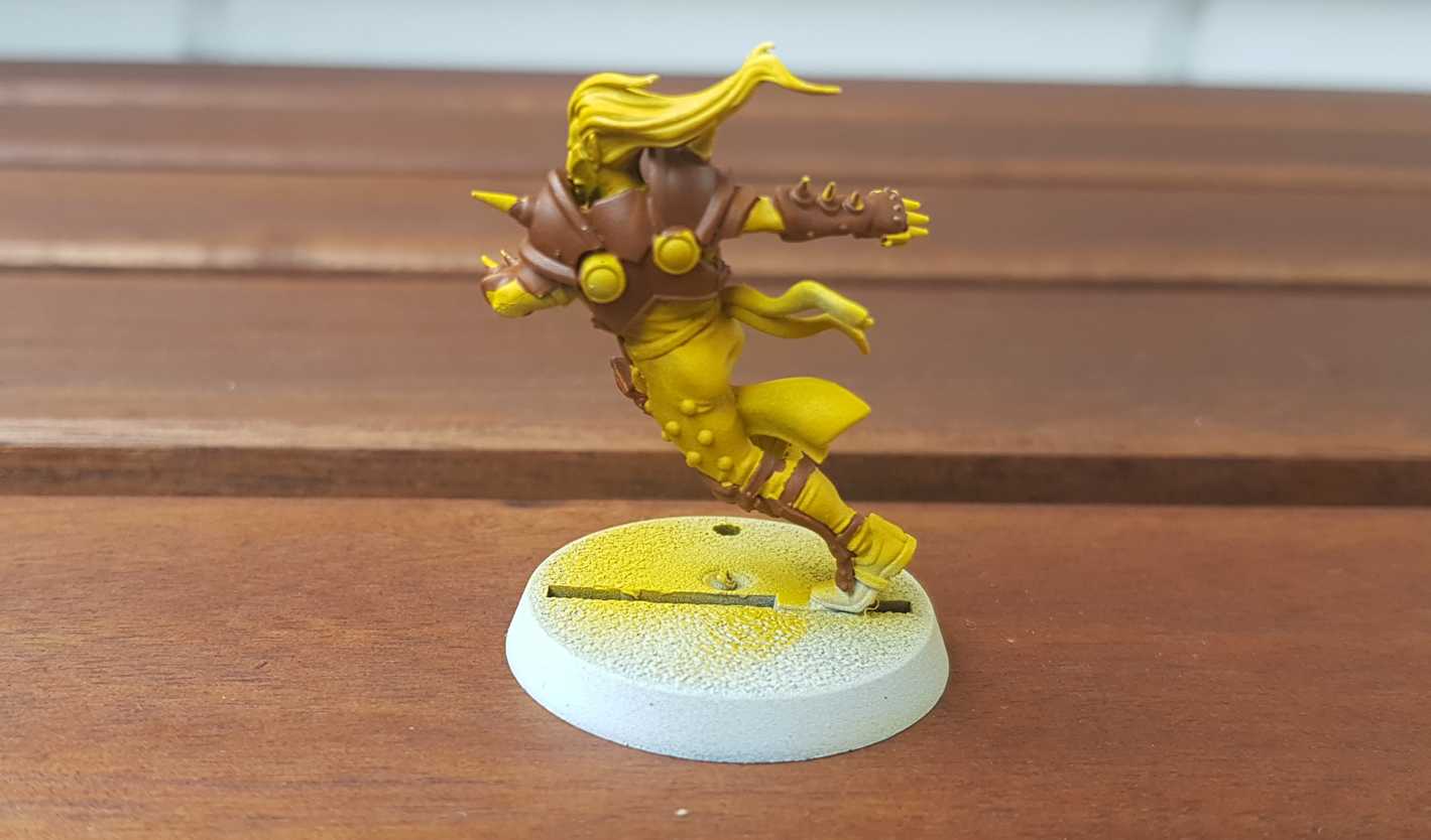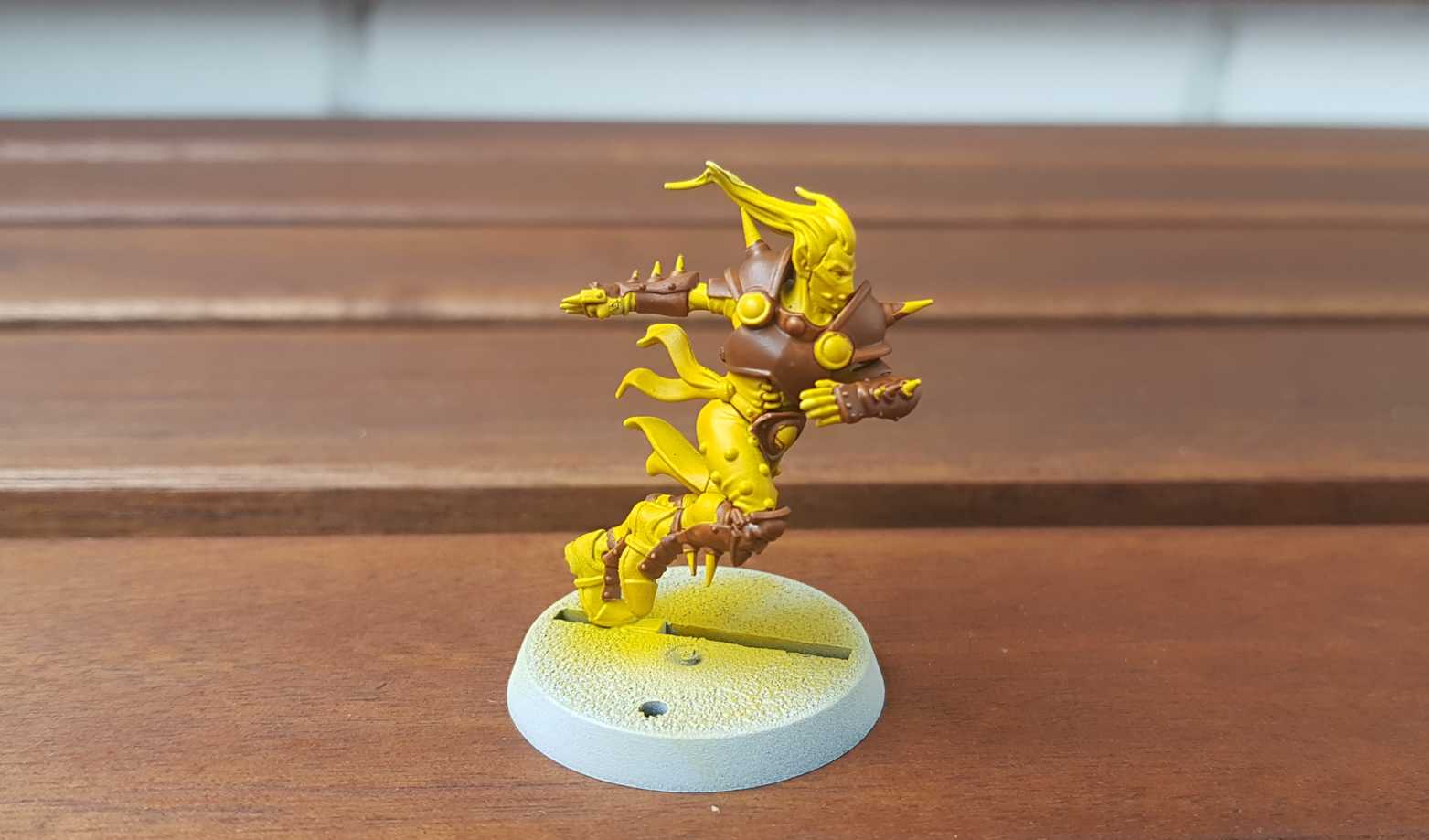 1. Jak widzicie, na zdjęciu mój model jest cały żółty. Aby przyśpieszyć malowanie, użyłam aerografu do rozprowadzenia farby na całym modelu, a dokładniej Vallejo – Amarillo Soleado. Oczywiście dokładnie tę samą czynność możecie wykonać pędzlem, używając farbki Citadel – Averland Sunset. Wtedy proponuję nałożyć farbę na ubranie, czyli spodnie, koszulkę z rękawami i rękawiczki. Jeśli korzystacie z pędzla, to może Wam się wydawać, że Wasza farba ma nieco inny odcień niż ta z aerografu. Macie rację, ale na dalszym etapie nie będzie to miało żadnego znaczenia.