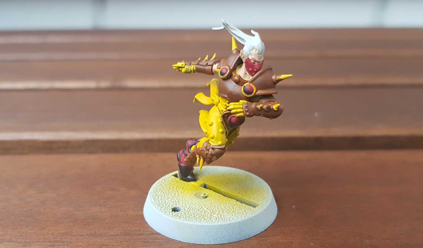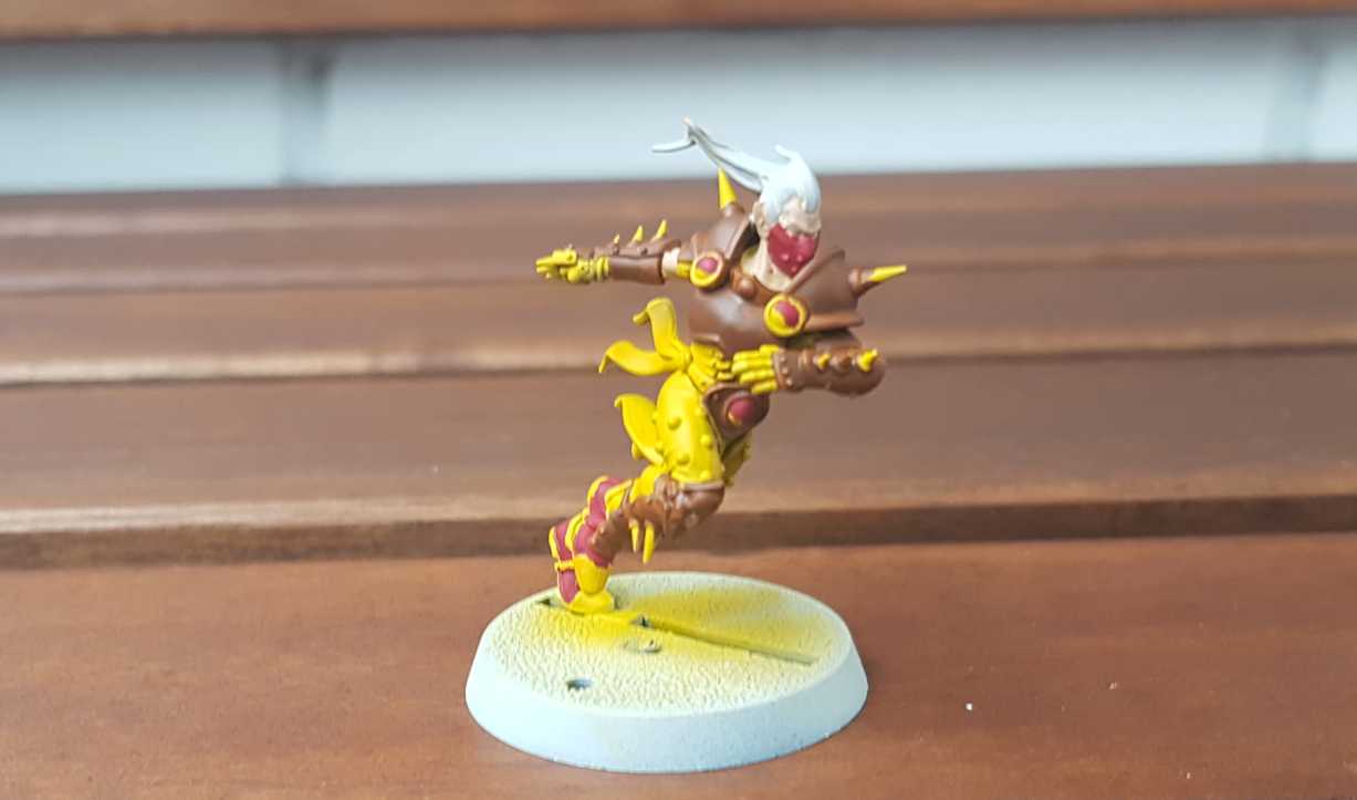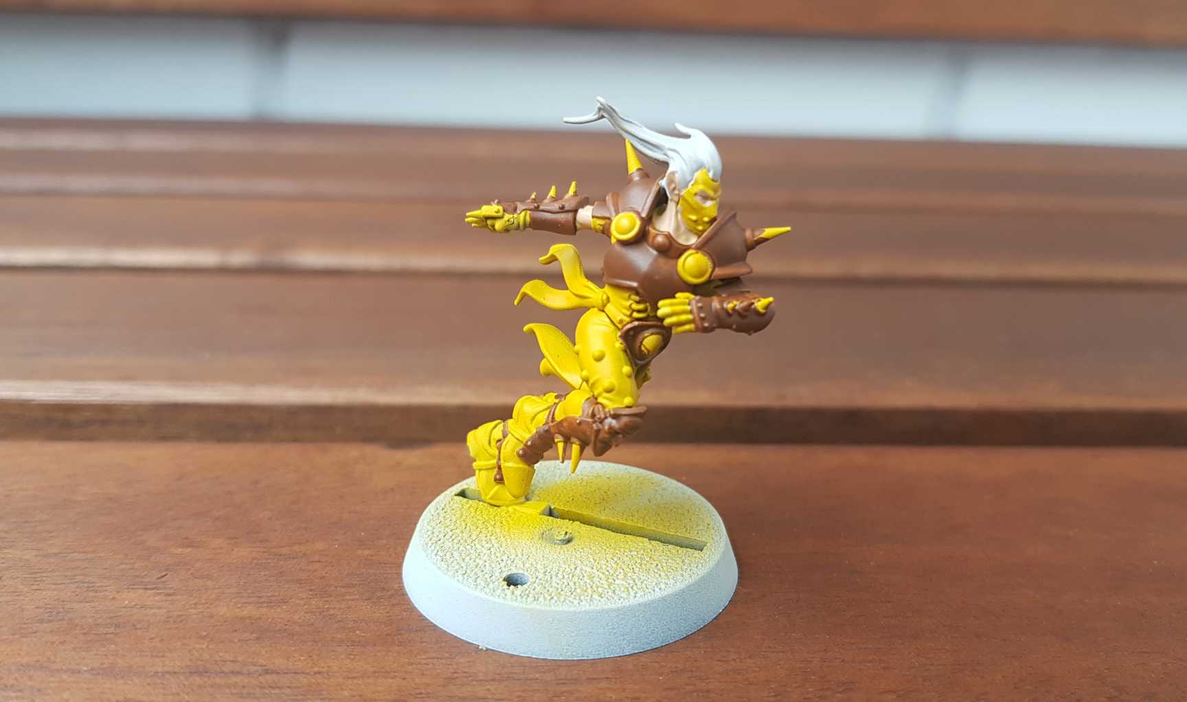 1. Na początku zaczniemy od najgorszej zabawy, czyli nałożenia highlightów na żółte elementy. Ja zdecydowałam się użyć farby Citadel – Yriel Yellow i przykryłam nią praktycznie całą powierzchnie ubrań, zostawiając Shade jedynie w zagłębieniach. Ponieważ nie można nałożyć zbyt dużo farby naraz, aby nie było widać nieestetycznych pociągnięć pędzla, należy uzbroić się w cierpliwość i potraktować odpowiednie miejsca kilkoma cienkimi warstwami.
