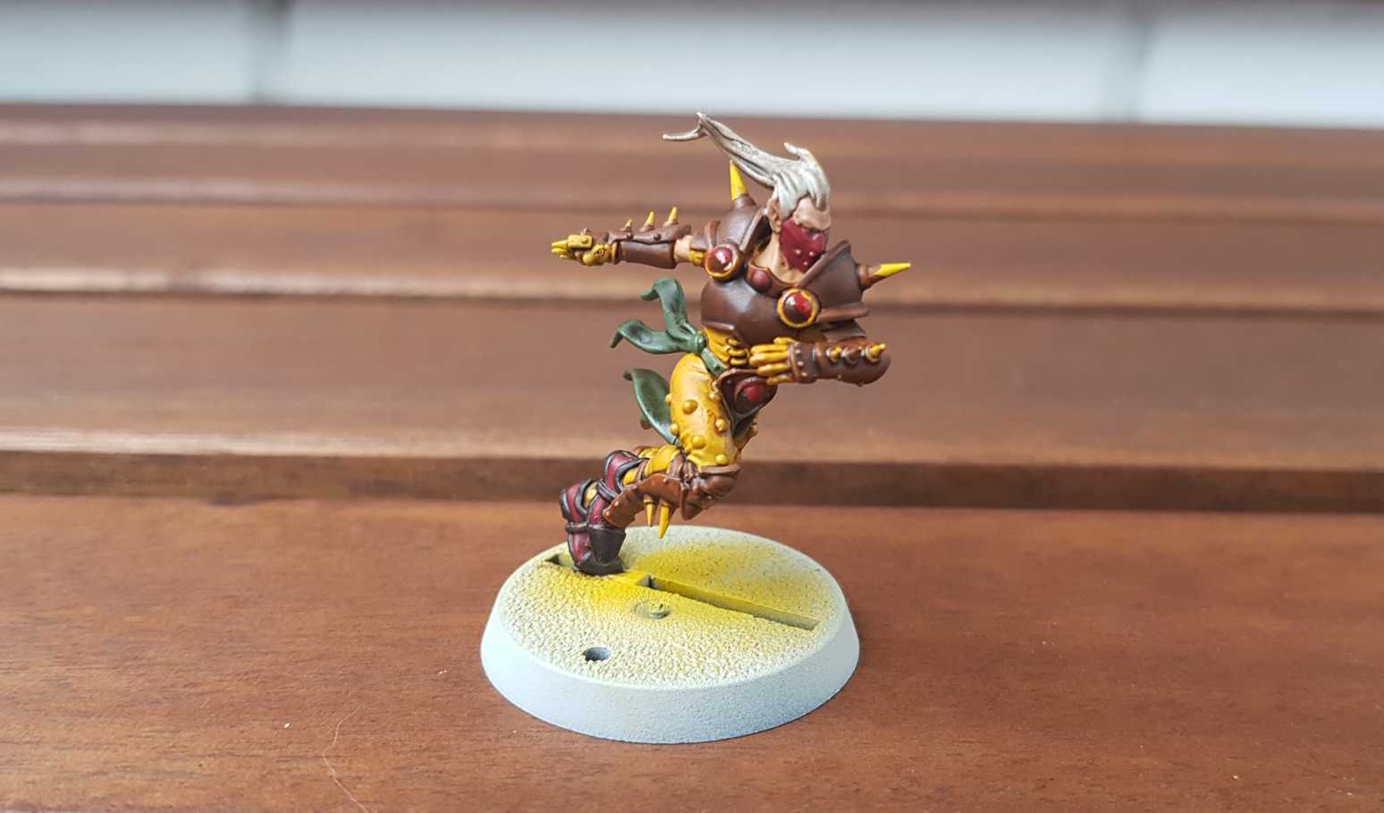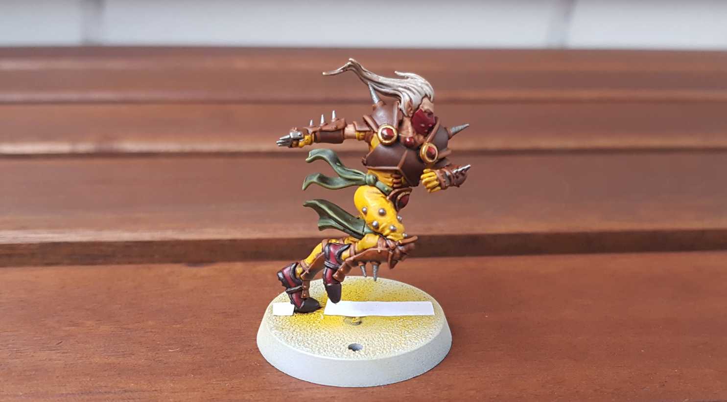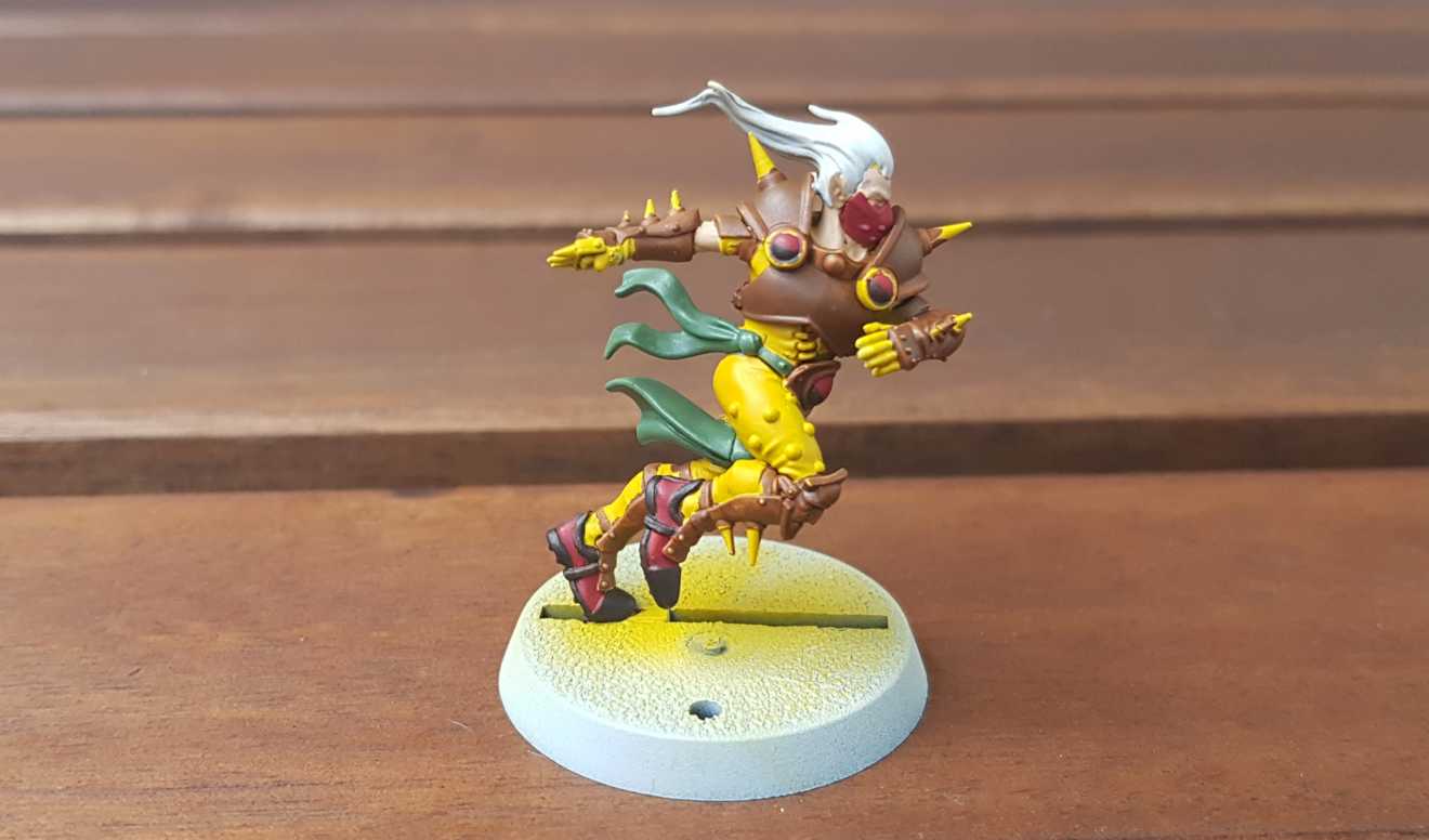 1. Na początku zaczniemy od najgorszej zabawy, czyli nałożenia highlightów na żółte elementy. Ja zdecydowałam się użyć farby Citadel – Yriel Yellow i przykryłam nią praktycznie całą powierzchnie ubrań, zostawiając Shade jedynie w zagłębieniach. Ponieważ nie można nałożyć zbyt dużo farby naraz, aby nie było widać nieestetycznych pociągnięć pędzla, należy uzbroić się w cierpliwość i potraktować odpowiednie miejsca kilkoma cienkimi warstwami.