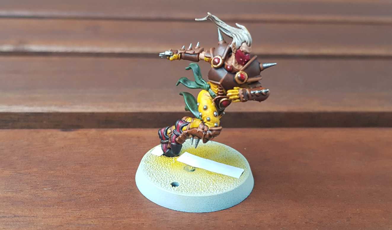 6. Już prawie kończymy! Została nam tylko głowa. Zacznijmy od włosów, na które nałożyłam kolor Citadel – Pallid Wych Flesh, zostawiając Shade tylko w zagłębieniach. Daje to ciekawszy efekt, niż zrobienie jedynie cienkich linii na wystających fragmentach. Jeśli chodzi o twarz, to tutaj znów odwrotnie do włosów farba Citadel – Kislev Flesh wylądowała jedynie na wystających fragmentach skóry.