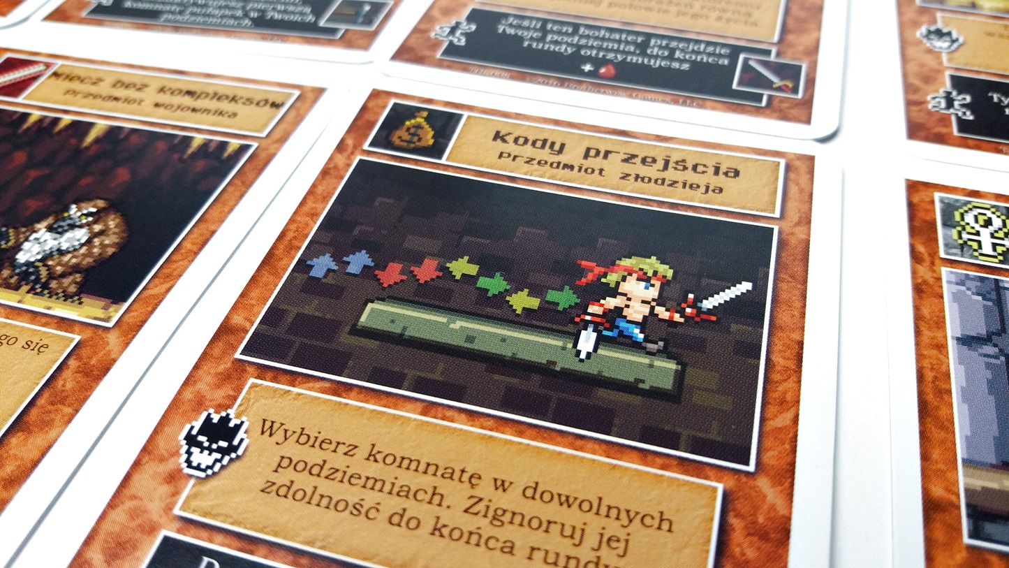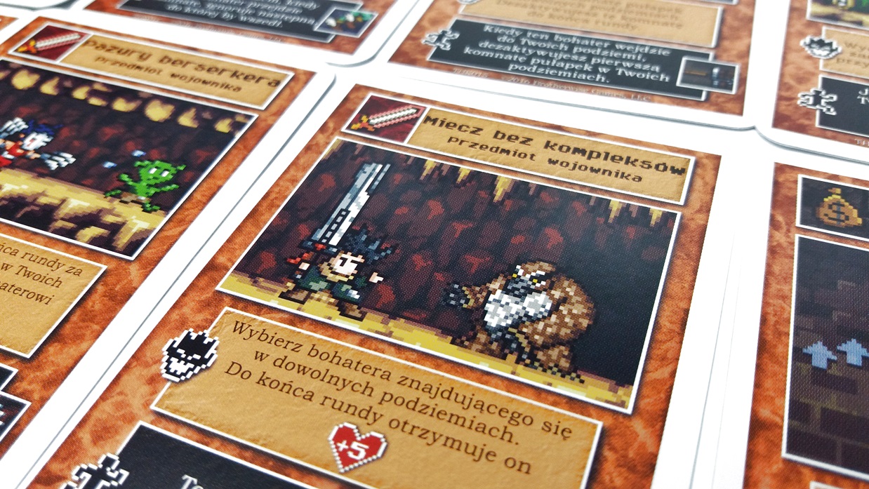 Jak sami widzicie, zdolności przedmiotów są najróżniejsze. Zastanawiacie się pewnie teraz, po co właściwie ich używać, skoro mają nam tylko zaszkodzić. Otóż jest również druga strona medalu. Gdy bohater z przedmiotem zginie w naszych podziemiach, to otrzymujemy tę kartę i od teraz możemy z niej skorzystać. Na karcie przedmiotu została wyszczególniona również ramka, w której znajduje się tak zwana „Zdolność Bossa”. Jest to jednorazowa umiejętność, z której możemy skorzystać podczas fazy budowy lub przygód.