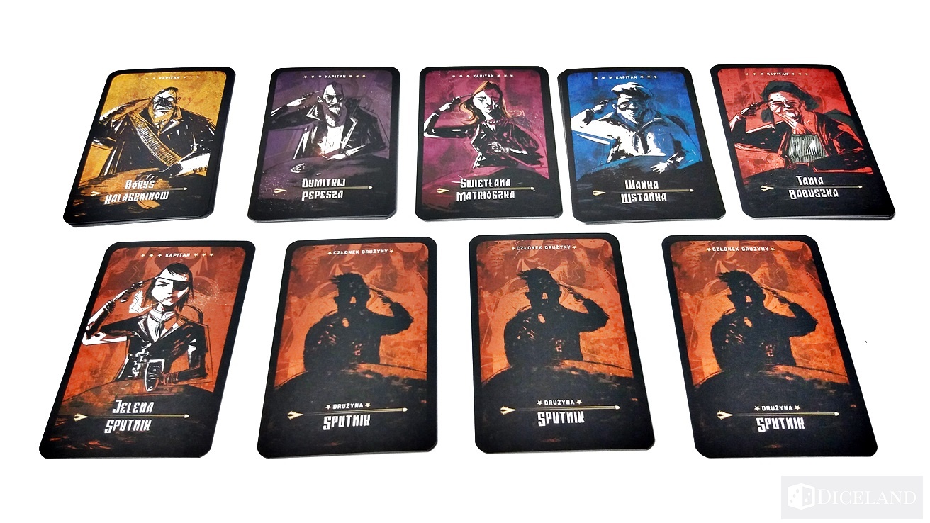 Rdzeniem gry są karty, które podzielono na: 31 kart akcji, 24 kart postaci dla 6 graczy, 6 kart pomocy oraz 55 kart magazynku. Zostały one utrzymane w takim samym stylu, jak ilustracja na okładce, przez co łatwiej wczuć się w klimat gry. Największe wrażenie zrobiły na mnie jednak ilustracje postaci, które jednoznacznie kojarzą się postaciami z rosyjskiej folkloru. W tym przypadku są one dość mroczne i wzbudzają niepokój, co jeszcze bardziej wpływa na doznania płynące z rozgrywki. Karty akcji zawierają natomiast specjalne zasady, które uatrakcyjniają Rosyjską Ruletkę i sprawiają, że każda rozgrywka jest niepowtarzalna i pełna pozytywnych emocji.