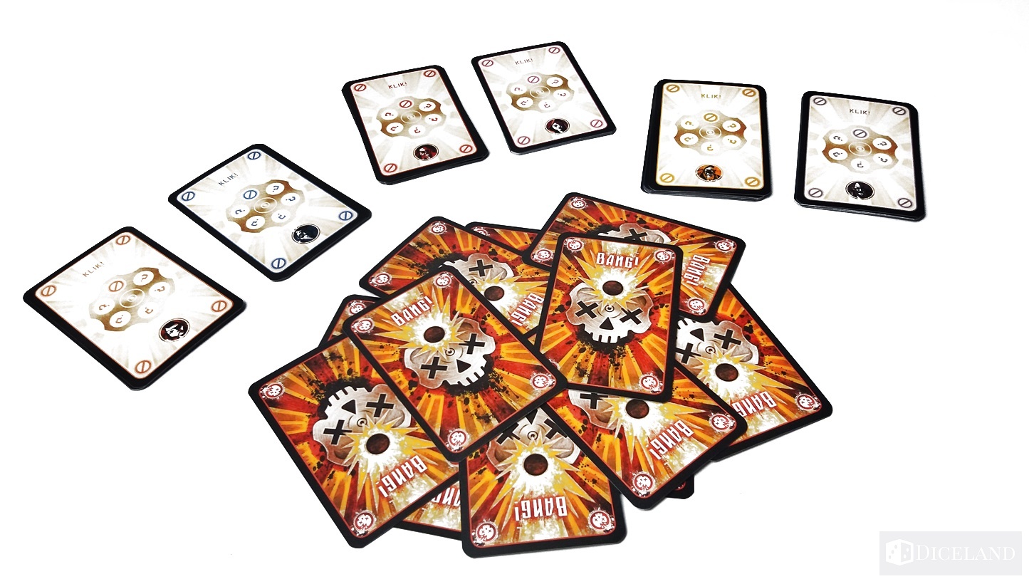 Każdy z graczy musi wybrać 1 z 6 kolorów i w jego ramach przygotować: 3 karty zawodników, 1 kartę kapitana, 1 kość, 1 kartę pomocy, 6 kart KLIK! również w tym samym kolorze, jedną kartę pocisku BANG! oraz 1 losową kartę akcji. Żetony naboi należy umieścić na środku stołu i to w zasadzie wszystko. Musimy tylko jeszcze pamiętać, by nasze karty KLIK! połączyć z jedną kartą BANG!