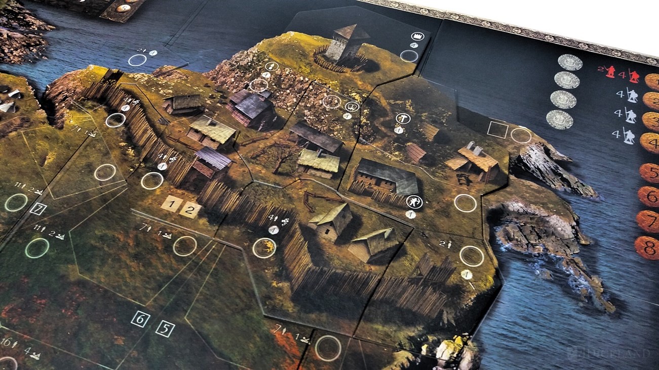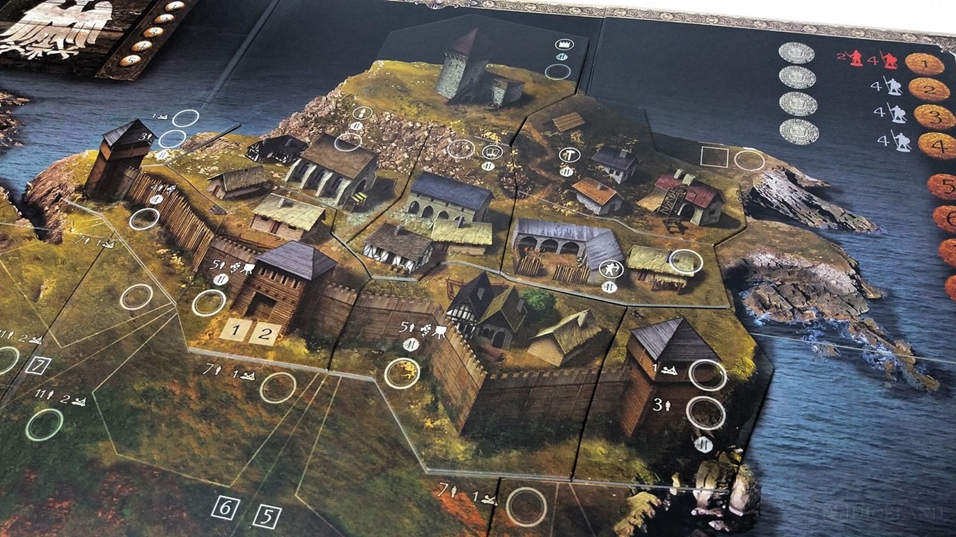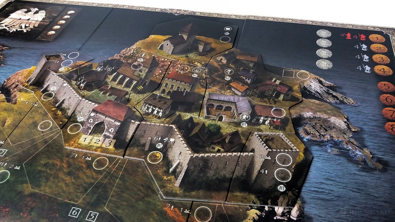 Pierwszym elementem, który trafia w nasze ręce jest plansza do gry. Przedstawia ona miasto, obozowisko oraz rozległe połacie terenu, po których będą się przemieszczały jednostki. Ogólnie rzecz biorąc to miasta tam jeszcze nie ma, gdyż dopiero w trakcie rozgrywki będziemy je rozbudowywali, jak również otaczające je fortyfikacje. Tereny wokół miasta zostały podzielone na różne strefy: szturmu, przedmurza i rozstawienia. Plansza została wykonana bardzo solidnie, a jej łączenia są niezwykle trwałe.