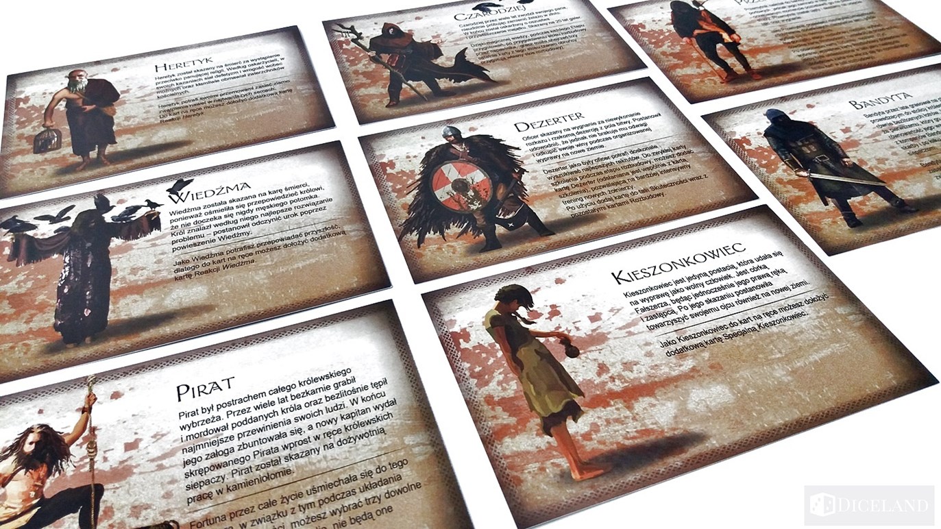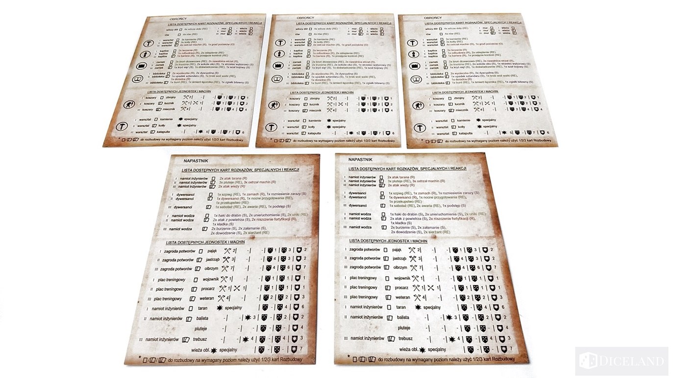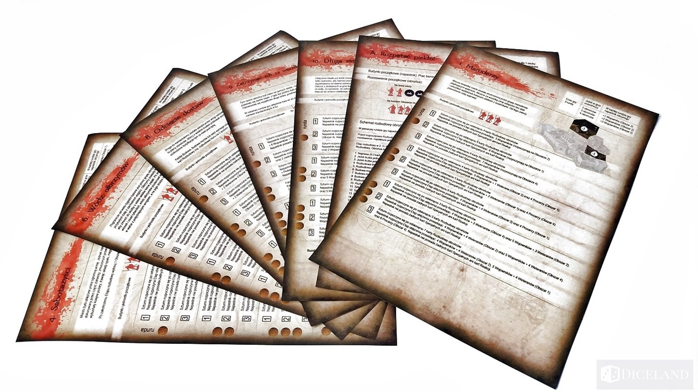 Do gry dołączone zostały karty pomocy, na których znajdziemy informacje o zdobywanych kartach podczas rozbudowy budynków oraz siłę i obronę każdej z jednostek. Karty pomocy są dwustronne – jedna z nich jest przeznaczona dla obrońcy, a druga dla napastnika. Zabrakło mi jednak na nich skróconego przebiegu tury, który byłby w tej grze bardzo przydatny. Do gry zostały również przygotowane scenariusze. Ich liczba i różnorodność i zmieniający się poziom trudności pozytywnie zaskakuje. Dzięki nim będziemy mogli zmierzyć się z oblężeniem nawet w samotności. Pozytywne wrażenie zrobiły na mnie również Karty Bohaterów. Zawierają one krótki opis postaci oraz specjalną indywidualną cechę, z której będziemy mogli korzystać podczas rozgrywki.