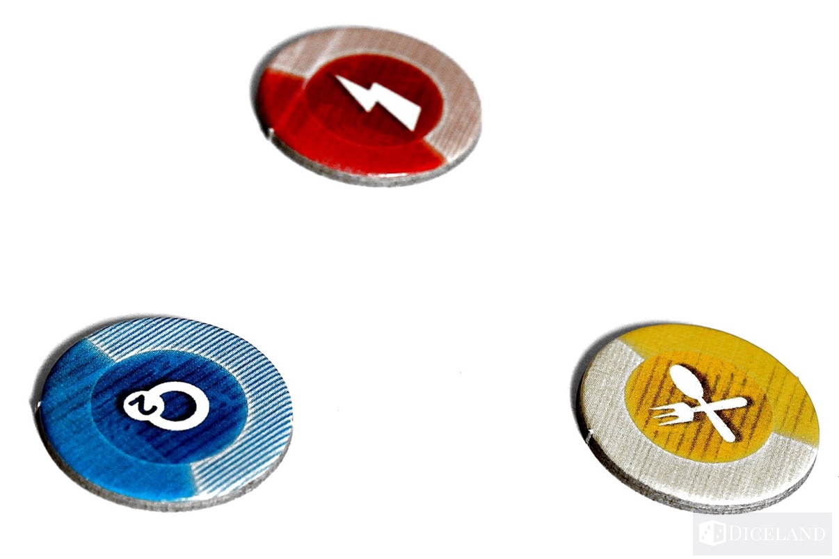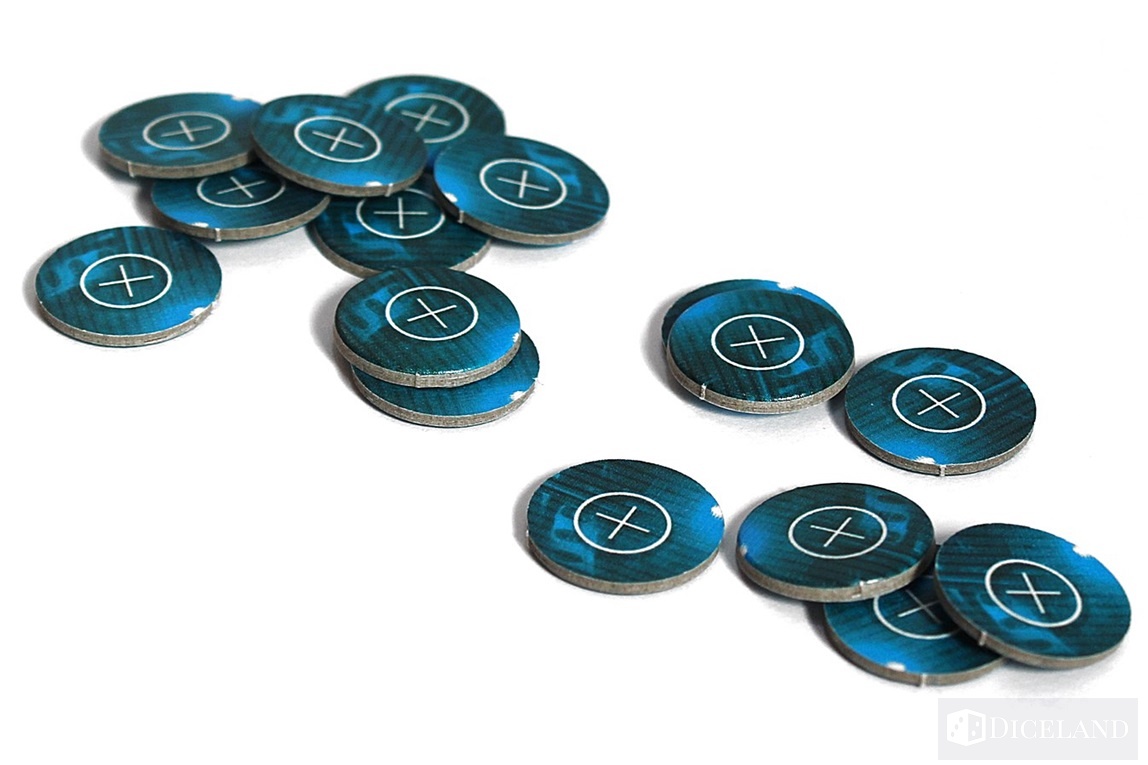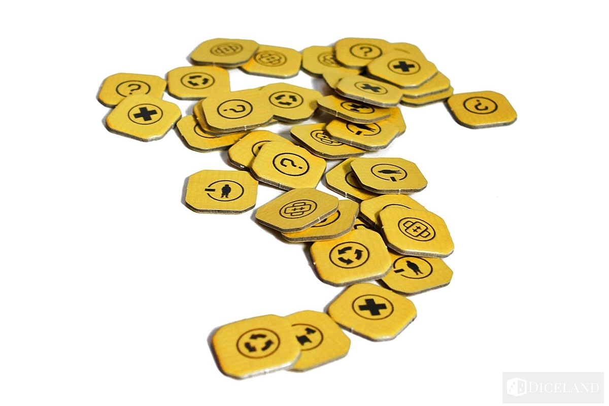 Wiele żetonów pomoże nam oznaczyć posiadane zasoby oraz cele na planszy. Zaliczymy do nich: liczniki zasobów, żetony części zamiennych, żetony celu, żetony morale, żetony wielokrotności, czy żetony istotnych punktów na mapie.