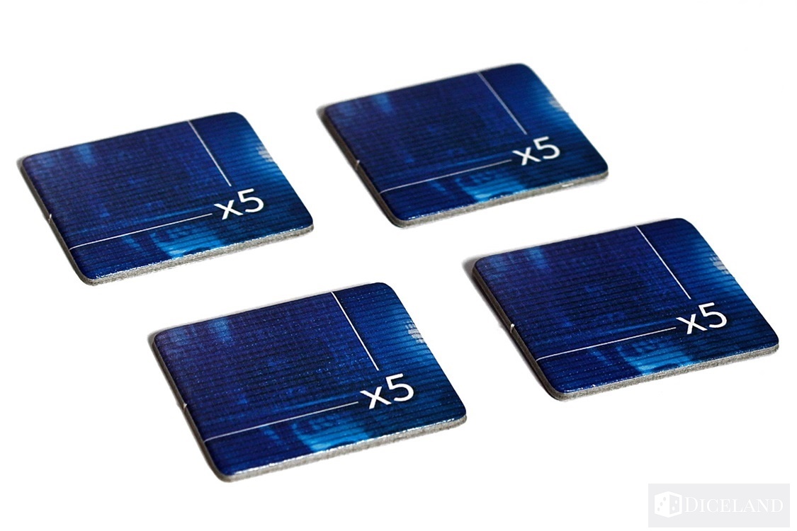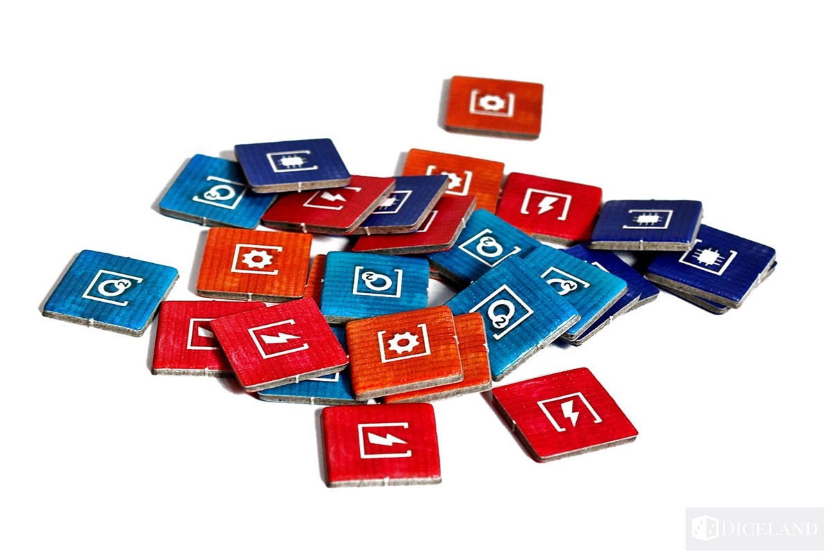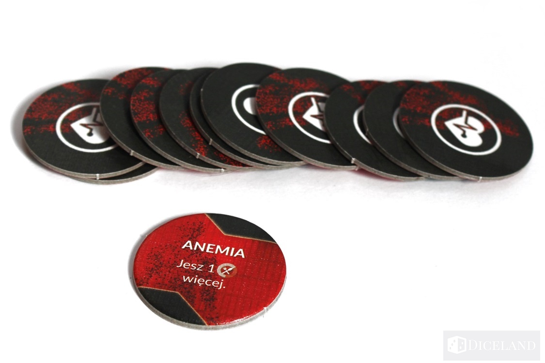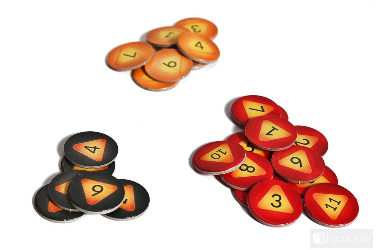 Wiele żetonów pomoże nam oznaczyć posiadane zasoby oraz cele na planszy. Zaliczymy do nich: liczniki zasobów, żetony części zamiennych, żetony celu, żetony morale, żetony wielokrotności, czy żetony istotnych punktów na mapie.
