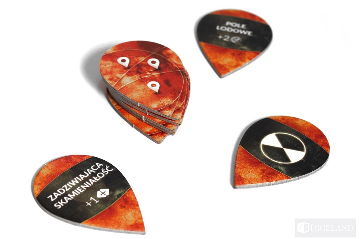 Ważnym elementem będą również kafle obszarów, które po ułożeniu na planszy symbolizują nowo odkryty fragment planety. Określą one ilość i rodzaj zasobów jakie na nich znajdziemy. Szczególnie niebezpieczne miejsca narażą nas także na dodatkowe konsekwencje, jeśli będziemy z nich korzystać.