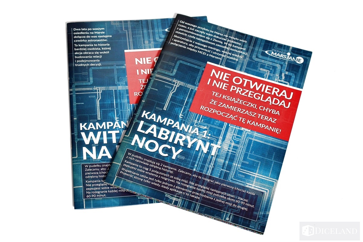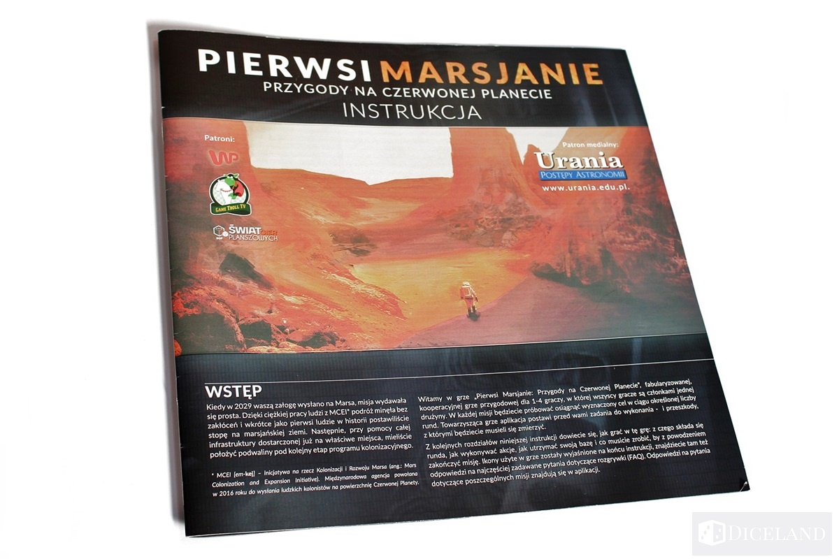 „Pierwsi Marsjanie” to masa elementów zamkniętych w kartonowym kontenerze. Pudełko przedstawia nam wizję stacji kosmicznej na czerwonej planecie. Po otworzeniu wieczka w nasze ręce trafi gruba instrukcja. Nie jest to łatwa lektura i na pewno w trakcie gry nie raz zdarzy nam się do niej sięgnąć, aby rozwiać nasuwające się wątpliwości.