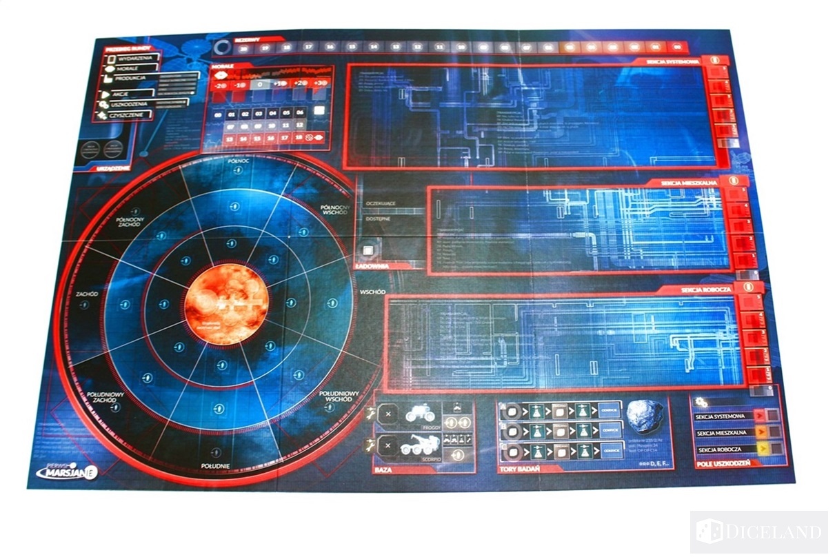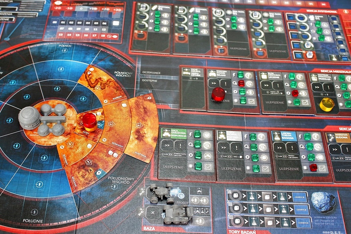 Następnie będziemy mogli rozłożyć planszę, która sama w sobie jest dość surowa i nieco ożywa po położeniu na niej wymaganych kafelków. Możemy ją podzielić na dwie główne części. Po lewej znajdziemy obszar Marsa, który będziemy odkrywać, z zaznaczonym położeniem naszej stacji badawczej. Po prawej zaś przygotowano miejsce na wyłożenie kafli, odpowiadających temu, co znajdziemy wewnątrz bazy. Później musimy zarezerwować sobie całkiem pokaźną ilość czasu na wyciśnięcie z ramek całej masy żetonów i wspomnianych kafli. Liczba tych elementów robi wrażenie. Oczywiście każdy z nich jest ważny w grze, jednak pozwolę sobie wybrać kilka istotniejszych, o których opowiem.
