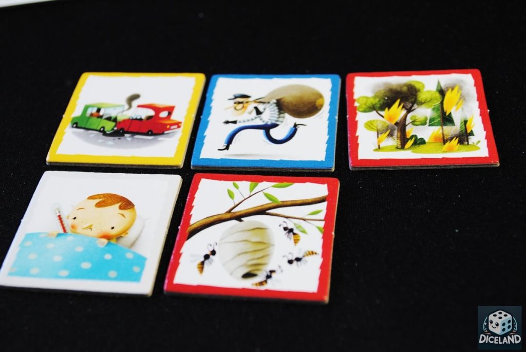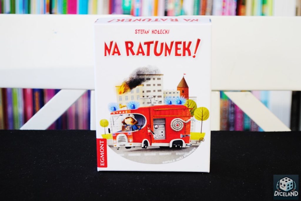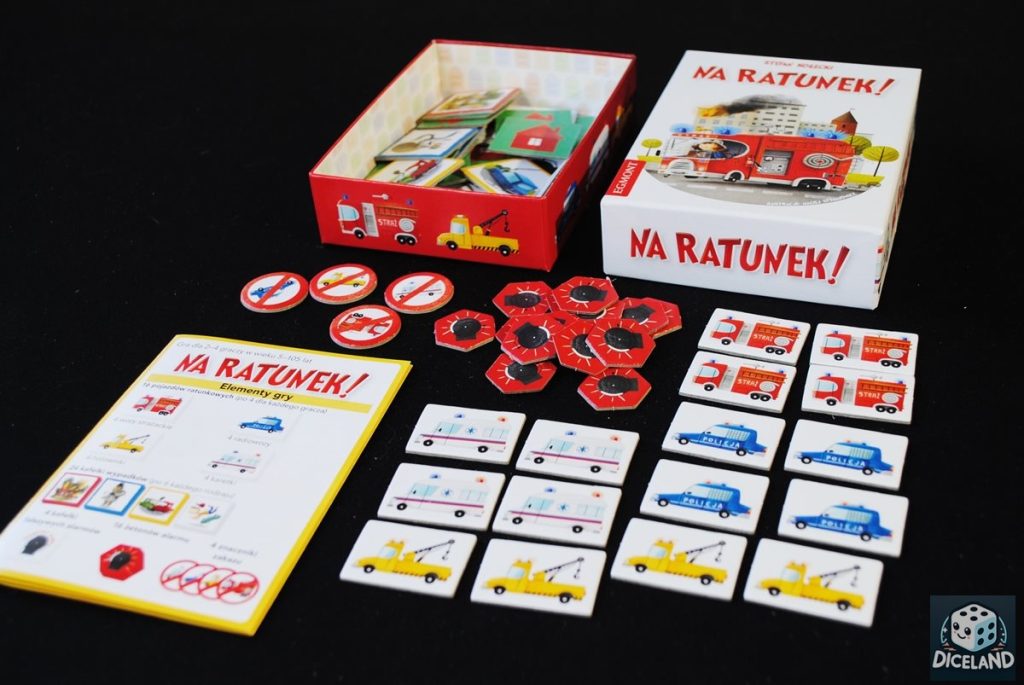 Na ratunek! to gra w malutkim opakowaniu, która bez problemu zmieści się do każdego plecaka, czy torebki. Po rozłożeniu na stole również nie zajmuje zbyt wiele miejsca, chociaż ze względu na ilość elementów raczej nie sprawdzi się u lekarza, czy w pociągu, gdzie kafelki mogłyby się łatwo zgubić. W środku opakowania znajdziemy płytki z różnymi sytuacjami (złodzieje, kot na drzewie, pożar, popsuty samochód), żetony alarmów, znaczniki zakazu, a także 4 komplety pojazdów ratunkowych. Do gry dołączono również krótką instrukcję. Wykonanie jest staranne, a na pochwałę zasługują piękne ilustracje Macieja Szymanowicza. Cena gry również jest atrakcyjna (ok. 25 zł), przewiduję więc kolejny hit wśród gier przeznaczonych na prezent dla przedszkolnych grup.
