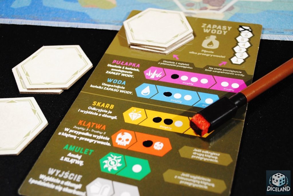 Słowowskazy to gra średniej wielkości, która jak przystało na wydawnictwo Rebel, może pochwalić się porządnym wykonaniem. W środku opakowania znajdziemy oryginalną materiałową, dwustronną planszę (z taką formą planszy spotkałam się do tej pory jedynie dwukrotnie: w Canvas oraz w Mandali). Planszę przed pierwszą rozgrywką warto położyć pod coś ciężkiego bądź wyprasować, aby umieszczane na niej kafelki równo do siebie przylegały. Kolejnym elementem gry jest solidna planszetka postępów, na której będziemy zapisywać nasze osiągnięcia za pomocą dołączonego do gry zmazywalnego pisaka. W skład zawartości wchodzą również 32 ładnie wykonane kafelki, na których będziemy zapisywać hasła, a także 150 różnorodnych kart mapy. Na każdej z nich znajdziemy inne hasła startowe oraz inny układ pułapek, skarbów, klątw itd. Karty są co prawda bardzo cieniutkie, ale nie będę one zbyt eksploatowane podczas rozgrywki. Nie zapomniano również o krótkiej, lecz wyczerpującej instrukcji przedstawiającej zasady gry.