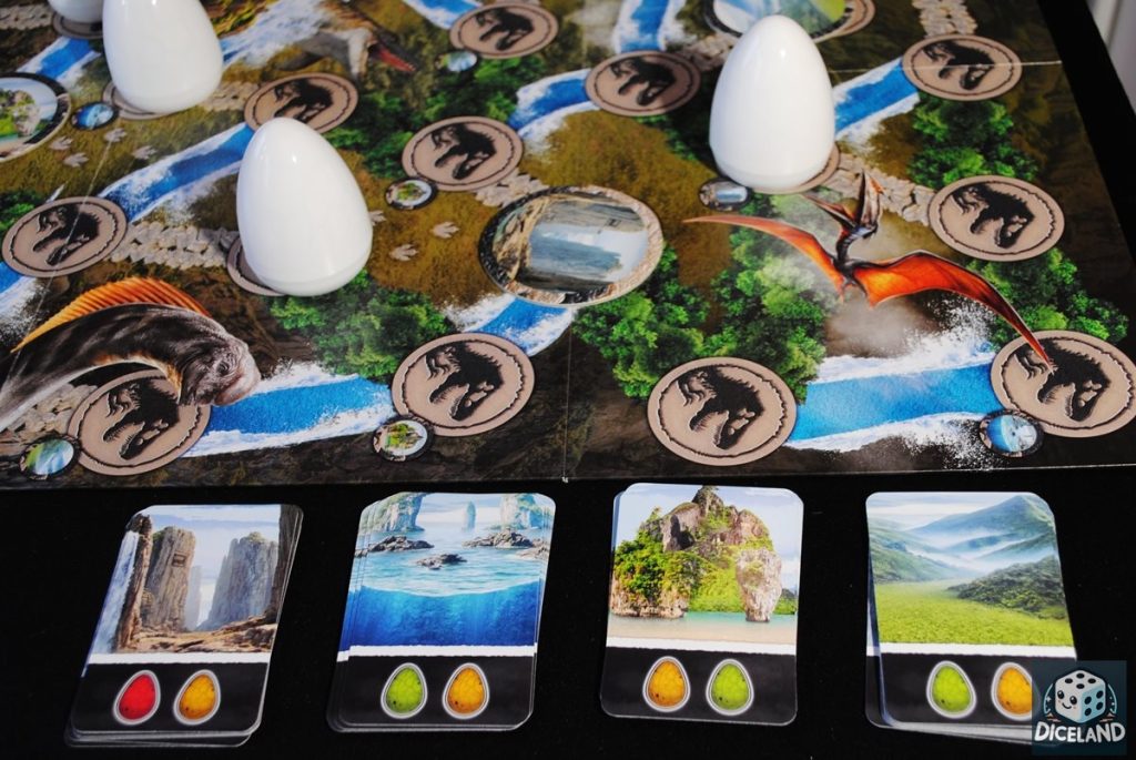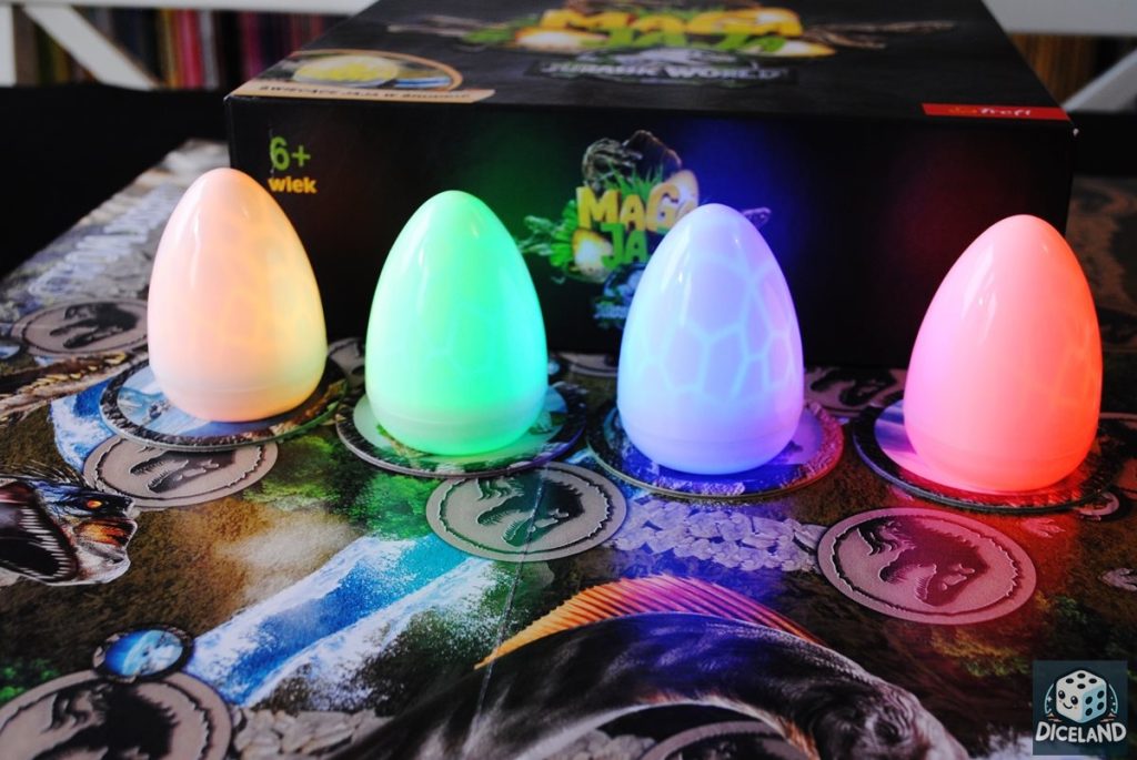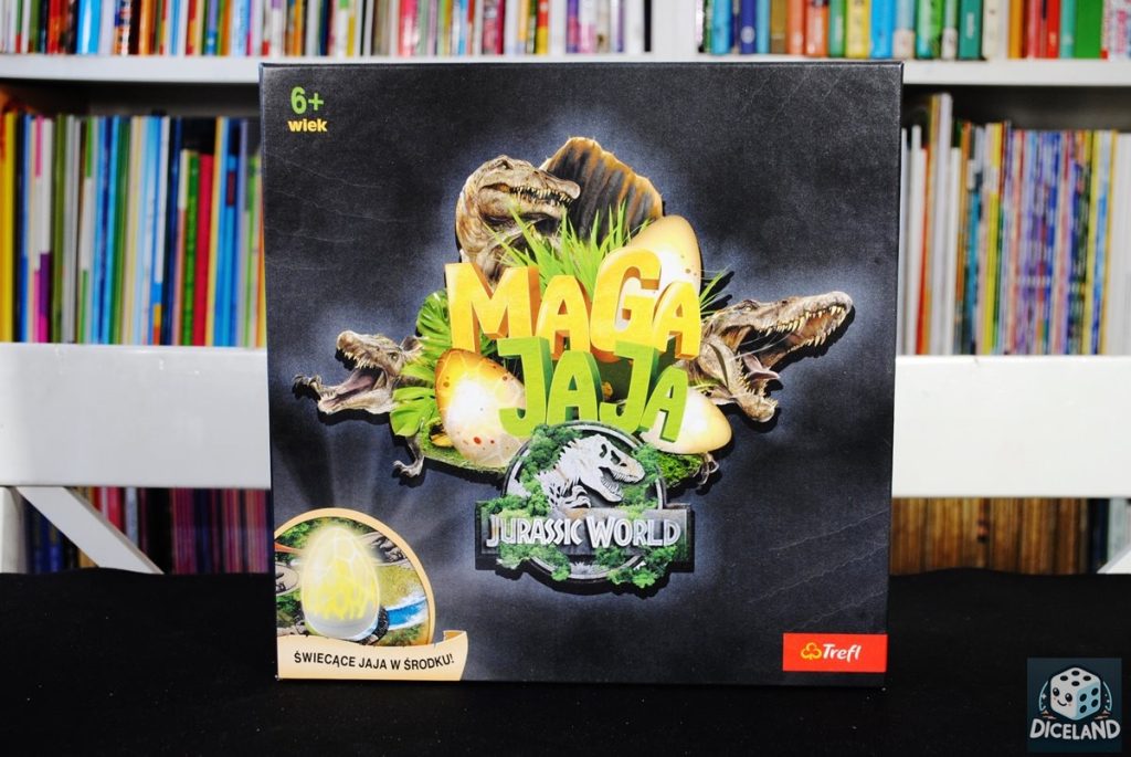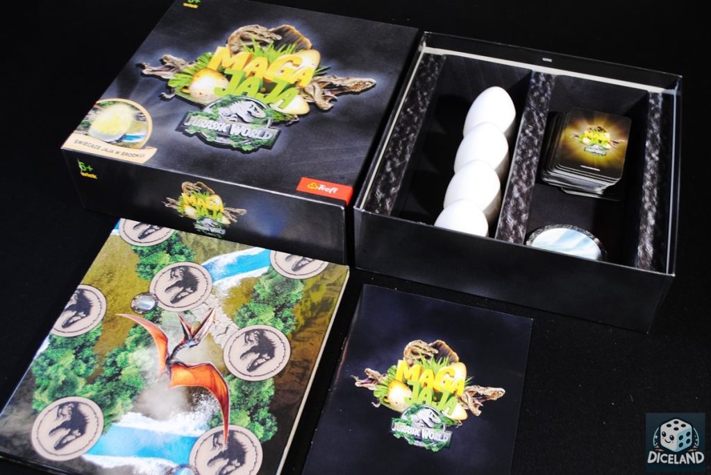 Magajaja: Jurrasic World to gra zajmująca duże pudełko, w którego środku musiały zmieścić się 4 duże, świecące jajka-lampki. Jaja są od razu przygotowane do zabawy i wyposażone w baterie, po otwarciu opakowania możemy więc od razu zasiąść do rozgrywki. W opakowaniu znajdziemy również ładnie zilustrowane karty ruchu i krain, żetony, dzięki którym jaja zaczną świecić oraz porządnie wykonaną, czytelną planszę. Klimat gry nawiązuje do Parku Jurajskiego, mamy tutaj rzeczki, skały i lasy… Każdy młody fan dinozaurów z pewnością będzie zadowolony. Do gry dołączono również krótką, lecz treściwą instrukcję.