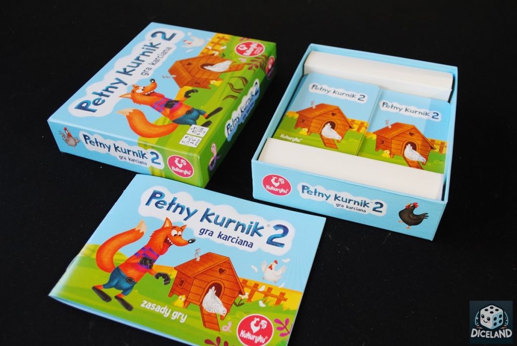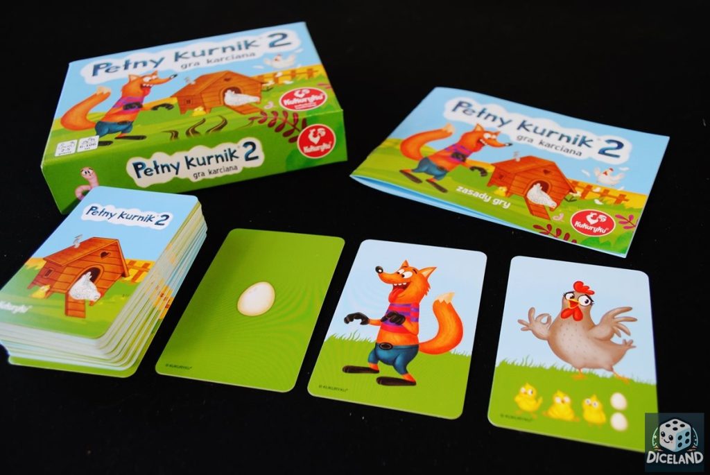 Pełny kurnik 2 to przede wszystkim zupełnie inny typ gry niż jego dwie poprzedniczki. To gra karciana, w której nie operujemy na żetonach i planszetkach – cała rozgrywka toczy się na kartach. Dzięki temu gra świetnie sprawdzi się w podróży, niewielkie opakowanie bez problemu zmieścimy do plecaka, czy torebki. Karty są ładnie wykonane, kolorowe i przede wszystkim czytelne, dzięki temu młodsze dzieci dobrze poradzą sobie z rozgrywką. W pudełku z grą znajdziemy również krótką instrukcję, dobrze przedstawiającą zasady rozgrywki. Warto wspomnieć również o cenie gry, Pełny kurnik 2 kupimy już za ok. 20 zł!