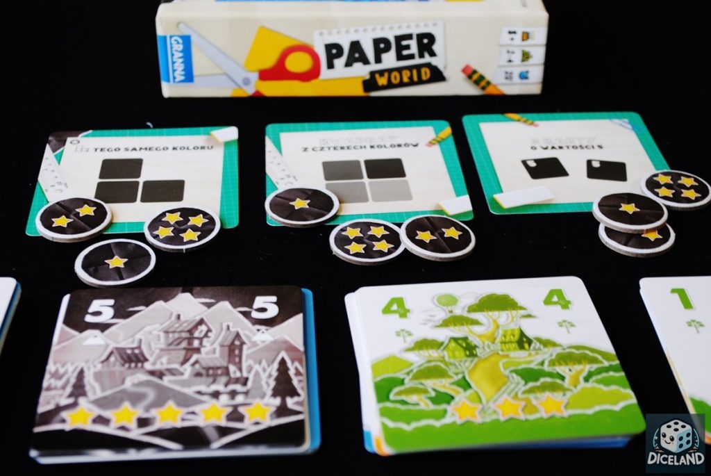 Oczywiście jak przystało na karciankę, w Paper World występuje losowość. Mamy jednak na nią spory wpływ, szczególnie że karty dobieramy aż z 5 stosów. Zdecydowanie bardziej niż szczęście przyda się tutaj logiczne myślenie... Podoba mi się skalowanie gry, w zależności od liczby graczy w grze bierze udział określona ilość kart, a także inne żetony punktacji. Rozgrywka nie jest zbyt długa i w każdym składzie trwa około 15 minut. To szybka gra, w którą możemy zagrać w wolnej chwili, a która przyniesie nam satysfakcję z zabawy i dobrze wykorzystanego czasu. W Paper World zagramy zarówno z młodszymi, jak i ze starszymi graczami. To nie jest infantylna karcianka, z pewnością spodoba się dorosłym, którzy docenią skondensowaną mechanikę i satysfakcjonującą rozgrywkę.