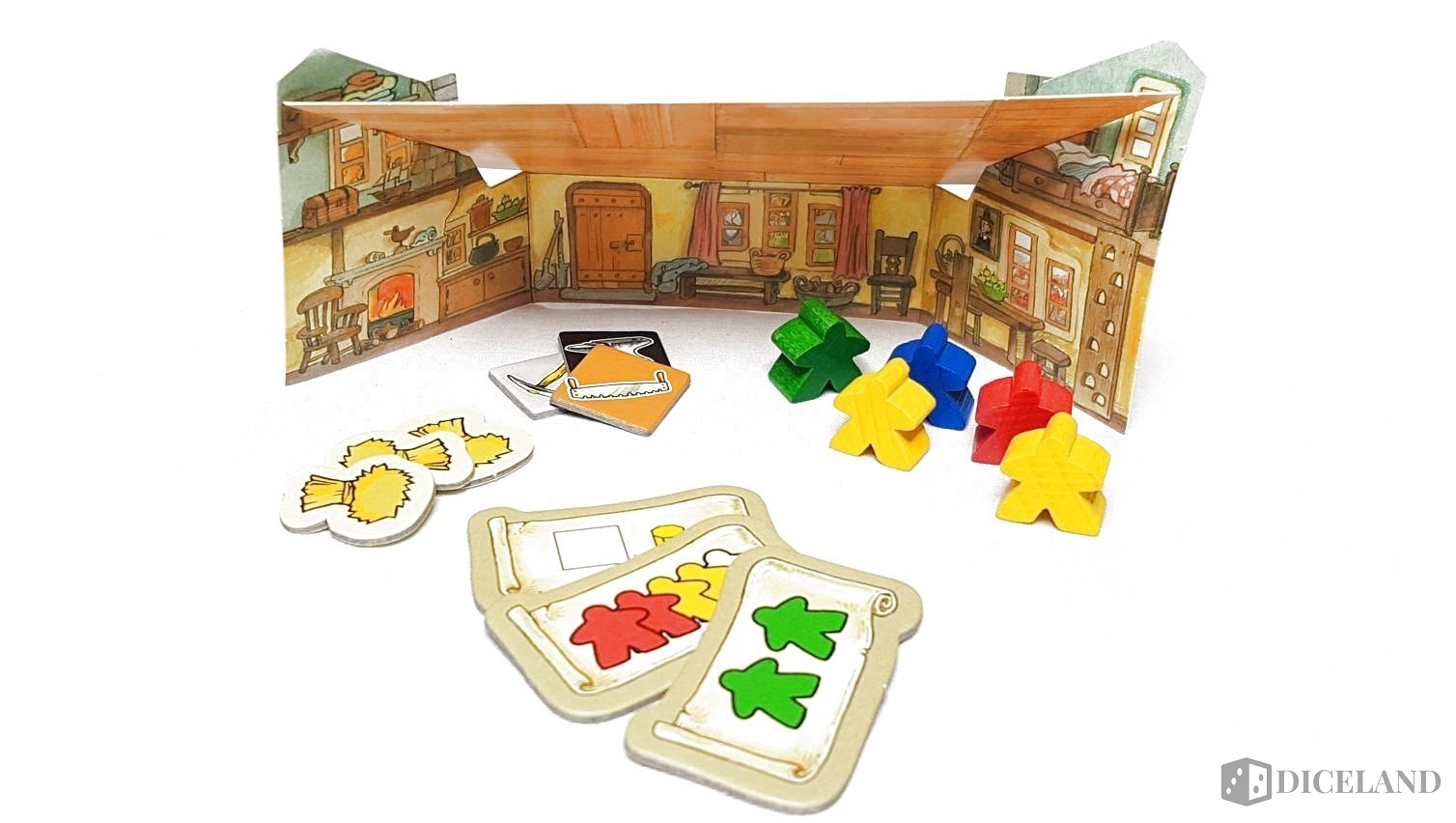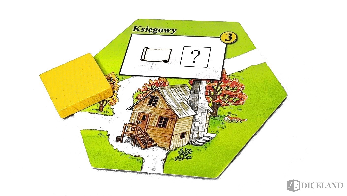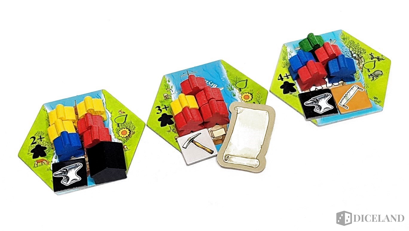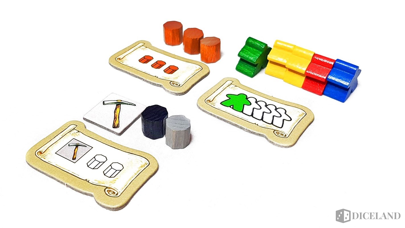 Naklejki, które znajdziemy w pudełku, musimy przykleić na 18 znaczników rozbudowy. Bardzo podoba mi się fakt, że znaczniki zostały wykonane z drewna, dzięki czemu idealnie pasują do reszty komponentów, czyli meepli oraz zwierząt (z dodatku Farmerzy). Po umieszczeniu naklejek na odpowiednim miejscu, nasze znaczniki zyskują koszt, jaki będzie trzeba ponieść przy rozbudowie budynków.