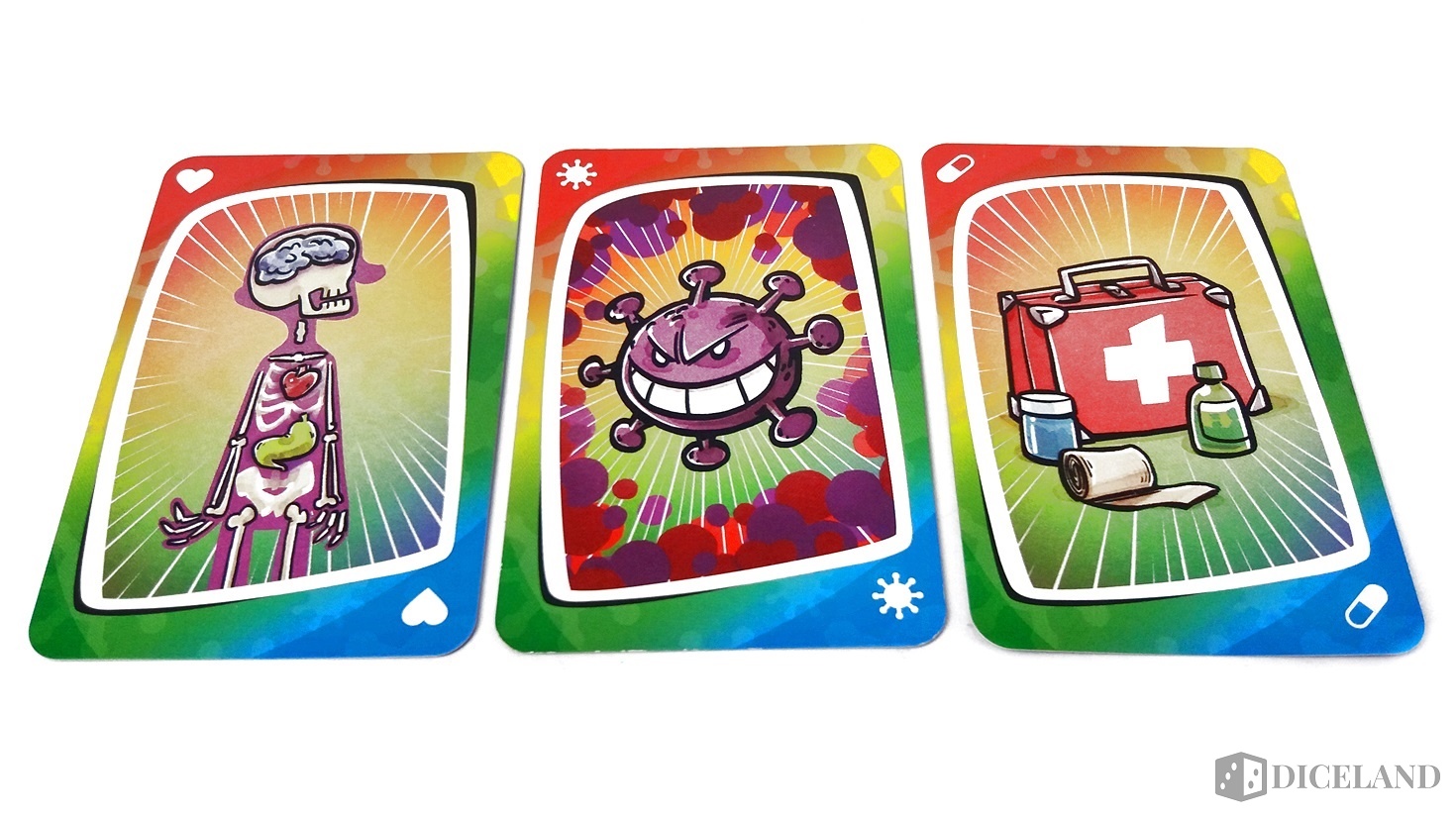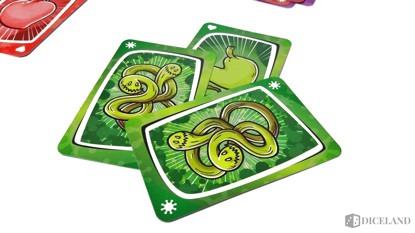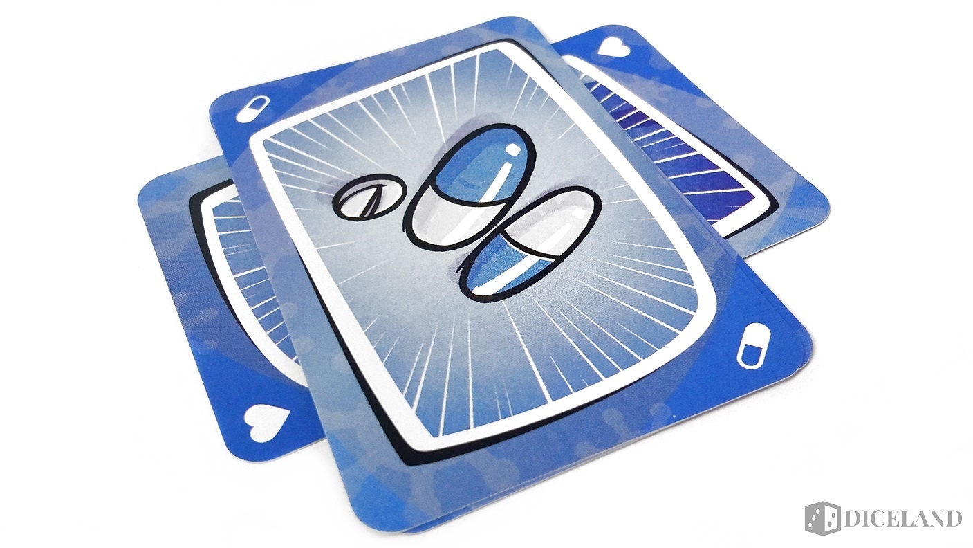 Karty zostały wykonane raczej standardowo, ale warto zwrócić uwagę ja humorystyczne, niezwykle barwne ilustracje. Znajdziemy tam m.in. różne wirusy, narządy, szczepionki, szalonych naukowców pozwalających nam na najróżniejsze akcje podczas gry oraz specjalne karty „jokery”. Dzięki specjalnej kolorystyce gra wyraźnie zyskuje na czytelności. Dodatkowo otrzymujemy dwie puste karty, na których możemy zapisać lub narysować własne akcje specjalne.