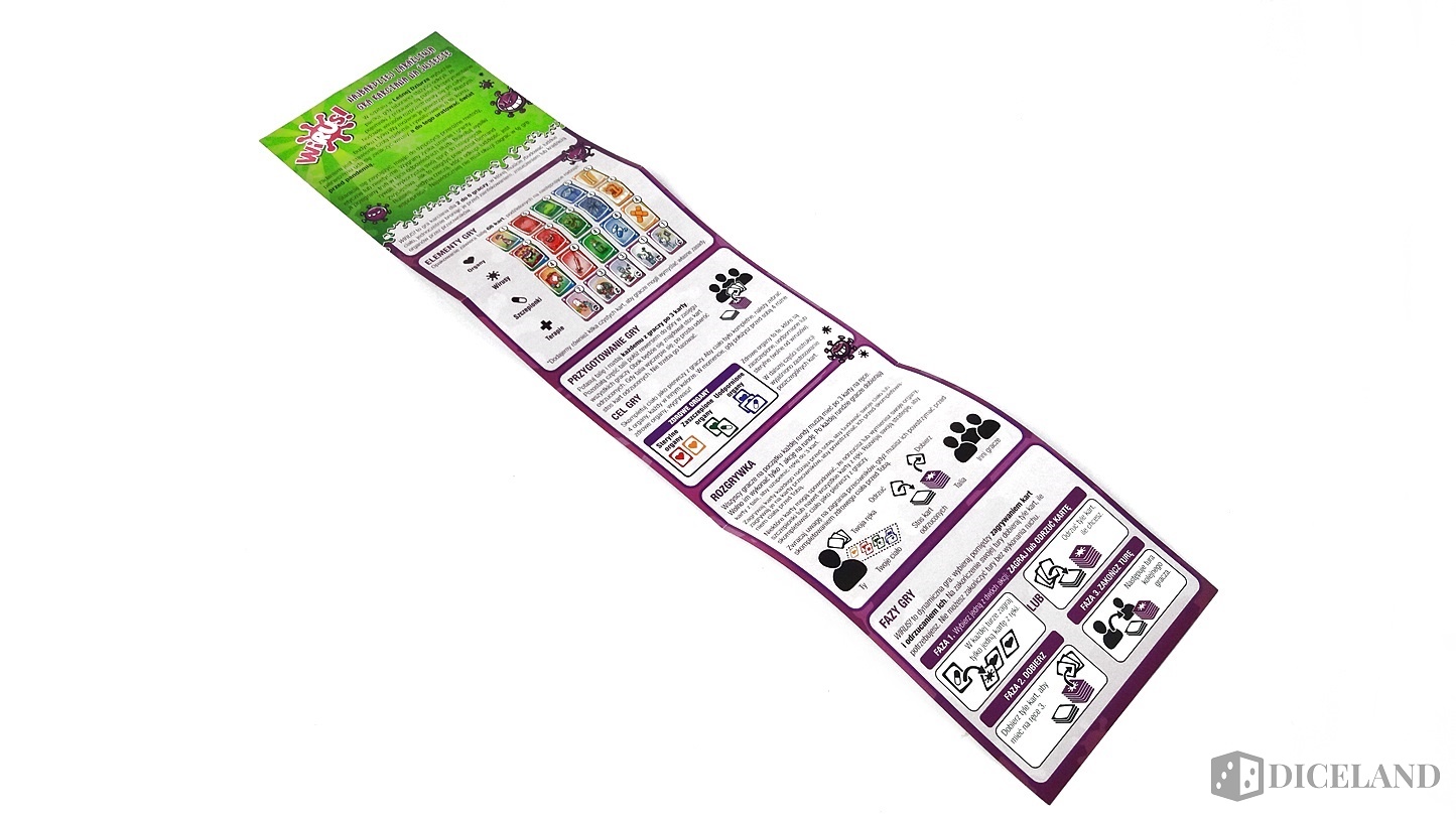 Trzeba przyznać, że wydawnictwo miało naprawdę ciekawy pomysł na akcję promocyjną tejże gry. Przejdźmy w końcu do konkretów, czyli pudełka i jego zawartości. Opakowanie gry Wirus! jest kompaktowe, dzięki czemu zabierzemy je ze sobą praktycznie wszędzie. Zaglądając do środka, ukazuje nam się krótka i dobrze napisana instrukcja do gry oraz 68 kart.