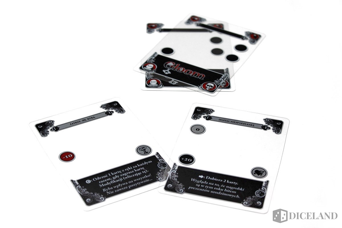 Najważniejsze w „Gloom” jest zwracanie uwagi jedynie na to, co jest widoczne. Zakryte punkty samooceny, symbole i efekty kart przestają obowiązywać. Dodatkowo możemy wykonać akcje specjalne. Istnieje możliwość odrzucenia całej ręki, jeśli nie widzimy w niej nic, co warto zagrać. Jeśli zrobimy to w pierwszej akcji, mija nam w ten sposób tura, ale w następnym ruchu mamy do wyboru zupełnie inny zestaw kart. Drugą opcją jest spasowanie. Tura nam przepada, nie zagrywamy kart. Ta możliwość była przez nas wykorzystywana najrzadziej.