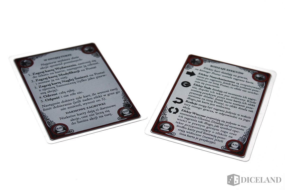 To wersja zasad, która przyjęła się w moim gronie. Niestety druga zasada, którą twórcy założyli przy tworzeniu „Gloom” nie przypadła nam do gustu. A szkoda! Gra ujawnia swój potencjał, gdy gracze, wraz z zagrywaniem kolejnych kart, opowiadają historię z piekła rodem. My daliśmy się lekko ponieść fantazji jedynie raz i była to zdecydowanie najlepsza partia. Jeżeli więc lubimy formę narracji, a tworzenie historii przychodzi nam z łatwością, to serdecznie polecam dodać ten wątek do gry, która dopiero wtedy nabiera rumieńców.