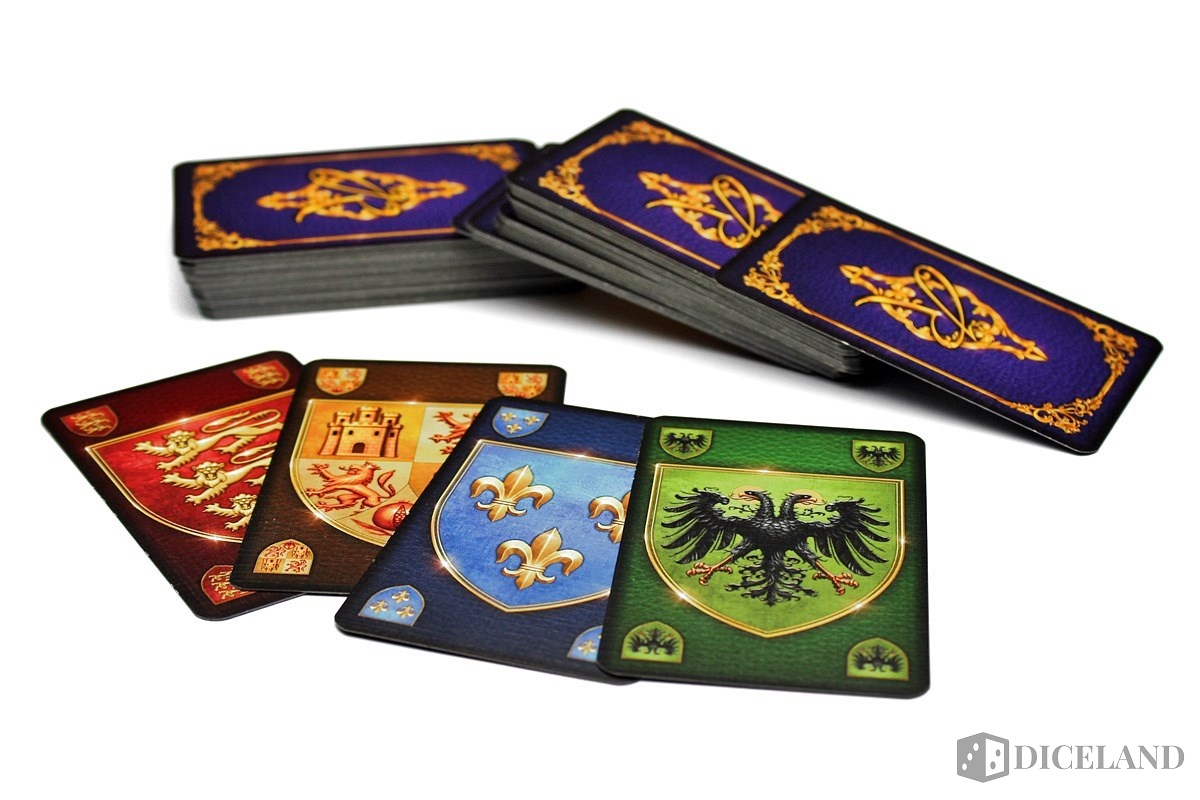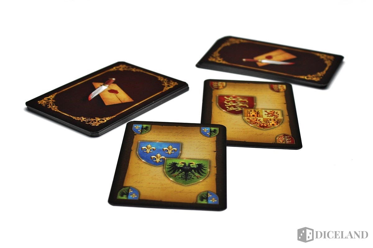 Wraz z grą otrzymamy dwie talie kart. Mniejsza z nich to intrygi, na których znajdziemy dwa herby państw obecnych w grze. Awersy większej zawierają pojedynczą grafikę z godłem danego kraju. Oba elementy prezentują się naprawdę ładnie i idealnie pasują do całości.