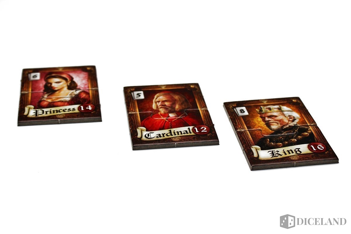 Najciekawszym rozwiązaniem są żetony portretów poszczególnych osobistości. Zaznaczono na nich liczbę punków przeznaczoną dla rodziny, w skład której wejdzie najwięcej postaci danego typu. Jeśli pomiędzy dwójką graczy dojdzie do remisu, żeton fizycznie zostanie podzielony pomiędzy nich, dając każdej ze stron połowę początkowej wartości.