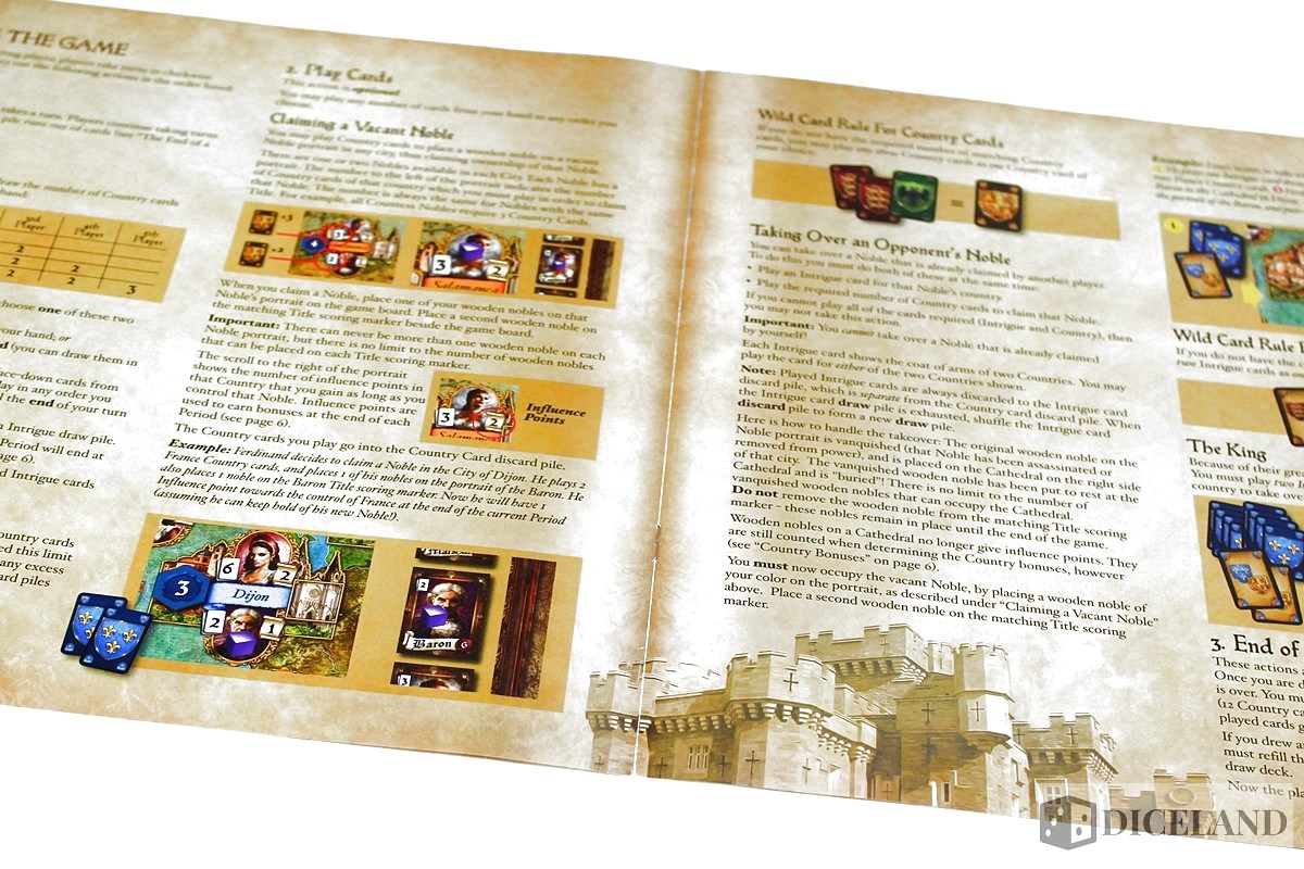Naszą drugą możliwością jest zagranie kart z ręki. Wykładając określoną liczbę kart tego samego kraju, możemy obsadzić wybrane przez siebie stanowisko. O tym ile ich będziemy potrzebowali, powie nam symbol z lewej strony portretu, przedstawiającego podobiznę odpowiedniego stanowiska. Marszałek wymagał będzie zatem tylko jednej karty, księżniczka zaś aż sześciu. Z prawej strony znajdziemy za to symbol pergaminu, na którym umieszczono informacje o sile wpływu danej postaci w państwie. Z reguły wyższy koszt akcji wiąże się z lepszymi profitami. Co ważne nie jest to akcja obowiązkowa. Możemy spokojnie zbierać karty na ręce, nie przekraczając limitu 12 kart państwowych i 4 intryg. Nie jesteśmy także ograniczeni liczbą akcji. Dopóki nie „skończy” nam się ręka, mamy pełną dowolność. Dzięki temu jeszcze większego znaczenia nabiera czas, w którym zdecydujemy się ruszyć do działania.