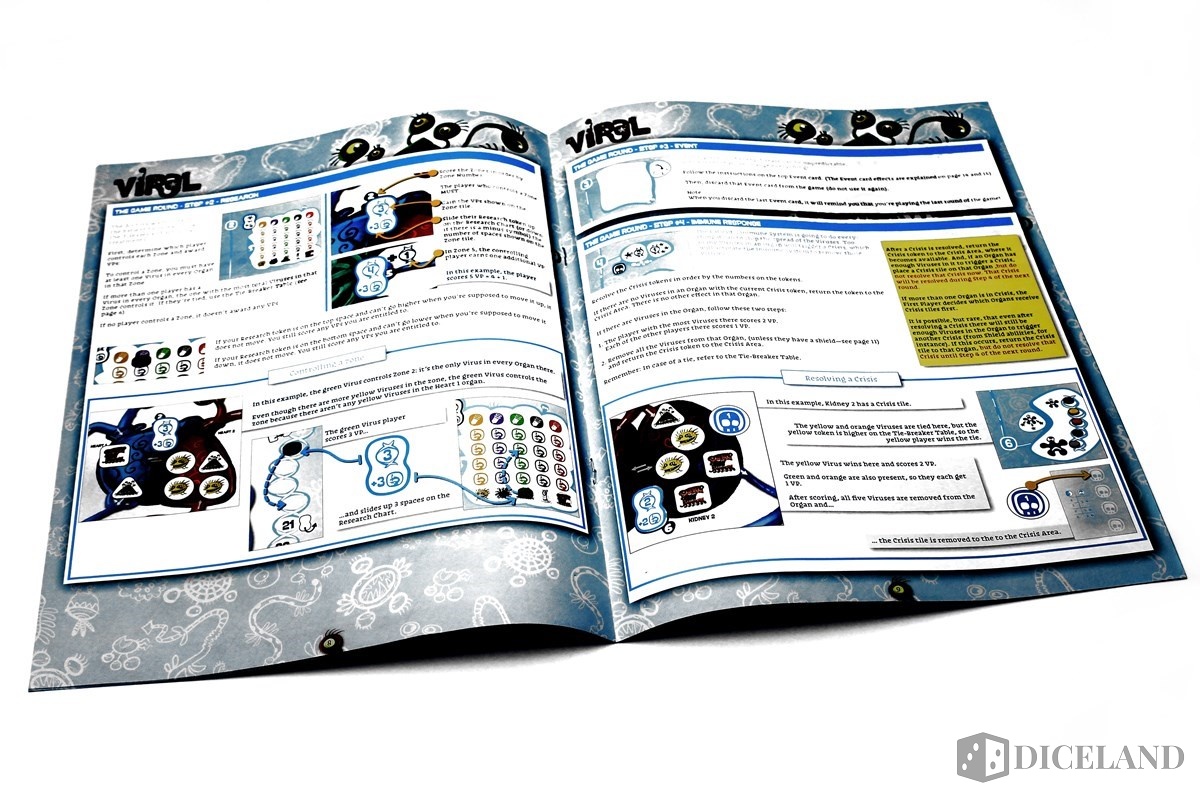 Każdy z graczy otrzyma też plansze z podobizną wybranego przez siebie wirusa. Ułatwia ona organizację, wyznaczając strefy na zagrywanie kart podczas pierwszej fazy gry oraz miejsce dla kart niedostępnych dla nas podczas bieżącej tury. To zdecydowanie jeden z bardziej kolorowych elementów Virala.
