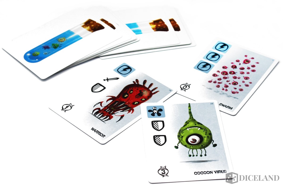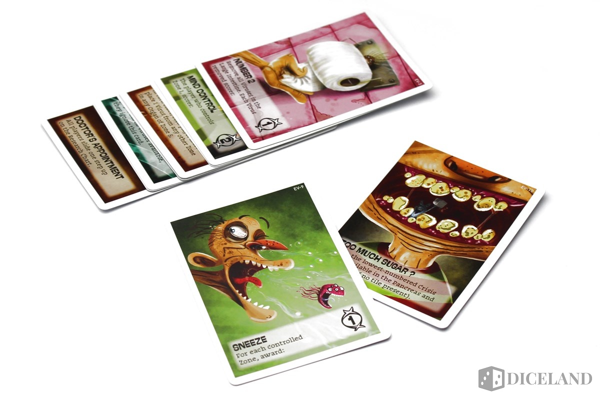 W pudełku znajdziemy także karty, podzielone na trzy rodzaje. Najliczniejszym i bardziej zmiennym są mutacje. Zawierają one ilustracje nowego rodzaju wirusa oraz symboliczne przedstawienie akcji, które możemy dzięki nim zagrać. Oprócz nich każdy z graczy otrzyma sześć kart przedstawiających poszczególne strefy na planszy. Ponownie przywita nas minimalizm. W pudełku znajdziemy również dwanaście kart wydarzeń, każdą zaopatrzoną w karykaturalną grafikę i krótki opis efektu działania.