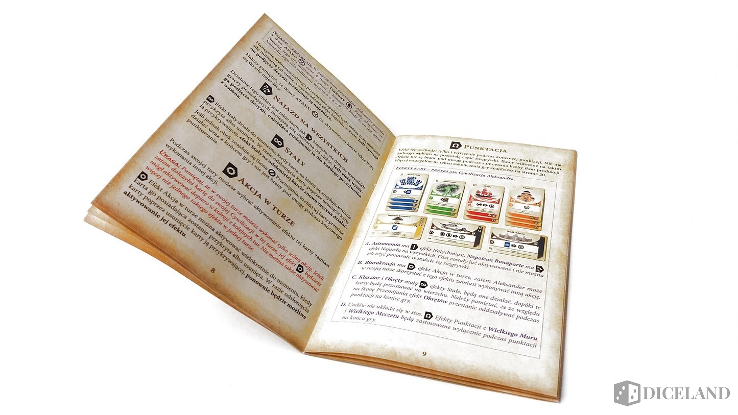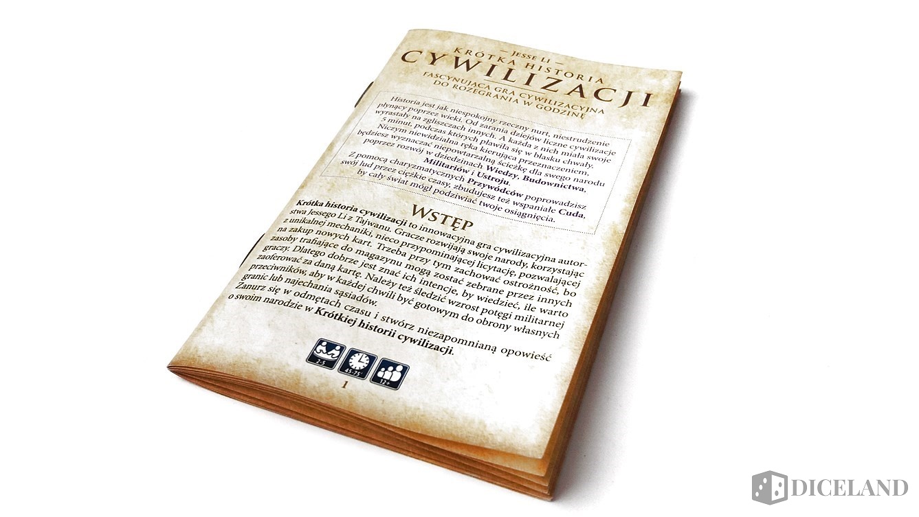 W średniej wielkości pudełku Krótkiej Historii Cywilizacji znajdziecie kilka ciekawych elementów niezbędnych, by rozpocząć rozwój cywilizacji. Przekonajmy się zatem jakie elementy tam na nas czekają. W pierwszej kolejności w nasze ręce wpada instrukcja do gry. Niestety jest ona niewielkiego formatu, przez co wygoda czytania jej nieco spada. Jeśli chodzi o część merytoryczną, to tutaj jest całkiem dobrze. Niuanse gry stają się dla nas jasne już po pierwszej lekturze. Duża liczba przykładów i ilustracji znacząco ułatwia zrozumienie zasad.