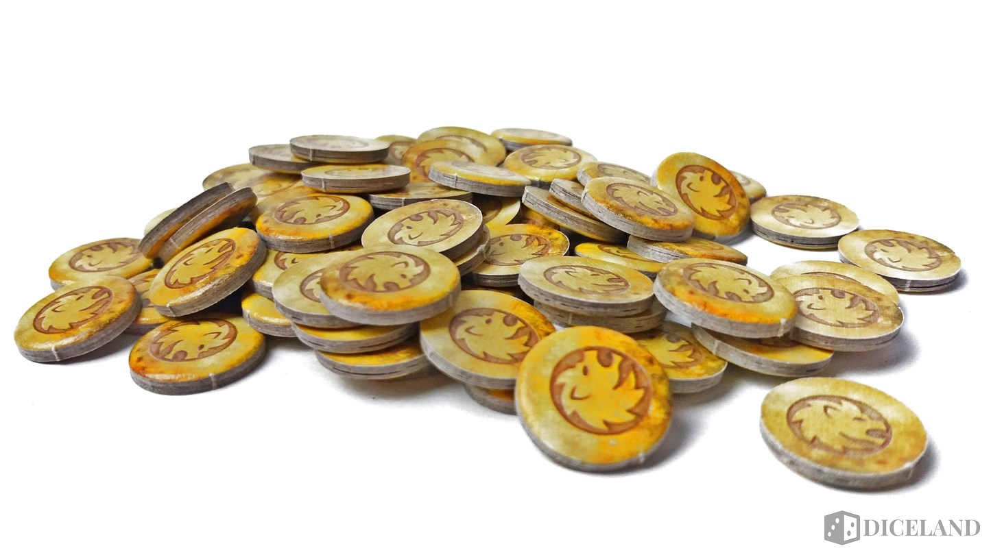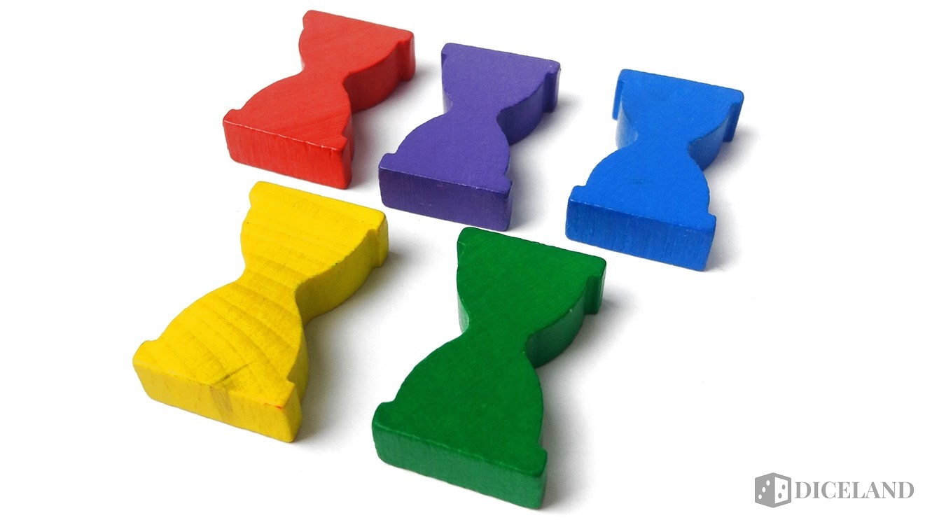 W pudełku swoje miejsce znalazły również kafelki z pomocami dla graczy w pięciu kolorach. Zostały one wykonane z solidnego kawałka grubej tektury, przez co posłużą nam przez lata. Drewniane pionki w kształcie klepsydr idealnie wpasowują się w temat gry i jej stylistykę, są idealnie wyważone i przyjemnie leżą w dłoni. Chyba najsłabszym elementem wykonania są tekturowe żetony, pełniące funkcję waluty w grze. Pomimo tego, że nie widać na nich żadnych śladów użycia. Żałuję, że nie pokuszono się tutaj o coś nieco trwalszego. Zabrakło mi też kilku różnych nominałów, które byłyby bardzo przydatne podczas rozgrywki.