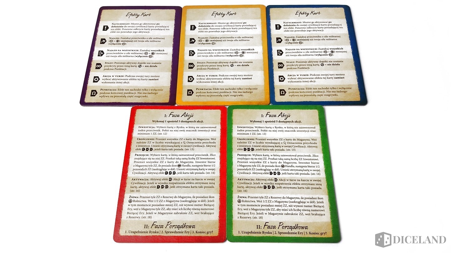 Jak zatem będzie wyglądała rozbudowa naszej wspaniałej cywilizacji? Za każdym razem, gdy ostatecznie uda nam się zdobyć którąkolwiek z kart, trafi ona do naszej puli. Będziemy je trzymać w kilku oddzielnych stosach, układając jedna na drugiej w poszczególnych kategoriach. W ten sprytny sposób działanie poszczególnych kart będzie zakrywane przez kolejne, silniejsze karty. Niektóre ikony jednak pozostaną niezakryte i przydadzą się podczas dalszej ekspansji naszego ludu. Karty dzielą się na 6 kolorów: