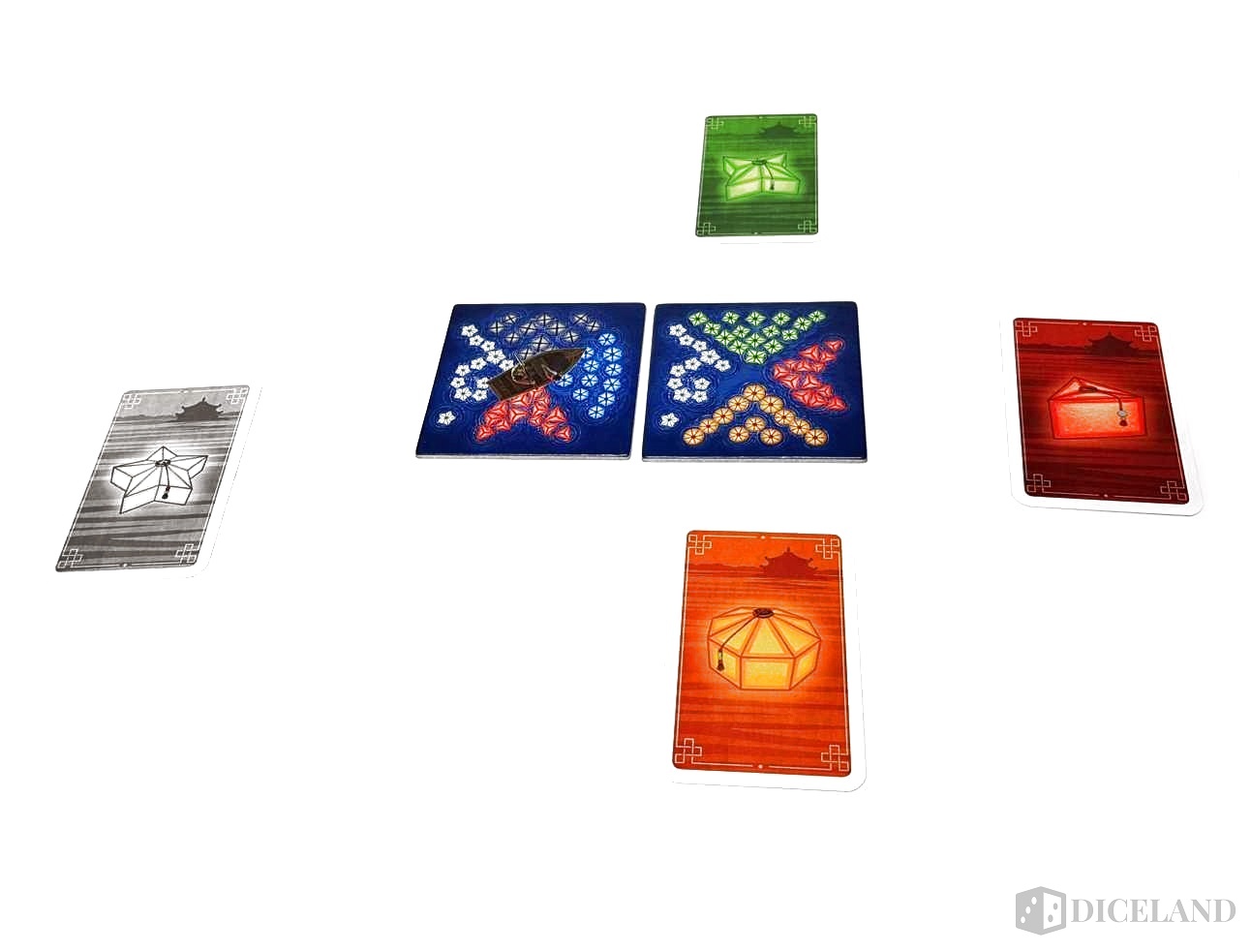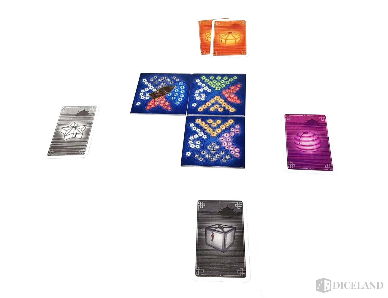 Jeśli wydaje Wam się, że zebranie 7 różnych lampionów może sprawić pewne problemy, to zapewne macie rację. Jednakże i na to jest rozwiązanie! Jeżeli zdobyliśmy dwie łódki, możemy zapłacić nimi za wymianę jednej z naszych kart lampionów na taką, która bardziej nam się przyda. Pozostaje tylko pytanie, skąd wziąć łódki? Niektóre z płytek jeziora, które będziemy co turę dokładać na stół, mają na sobie nadrukowany specjalny symbol. Jeśli nową płytkę z dowolnym symbolem dopasujemy kolorem lampionów do co najmniej jednej krawędzi płytek położonych już na stole, wtedy otrzymujemy zarówno karty lampionów, jak i drewnianą łódkę.