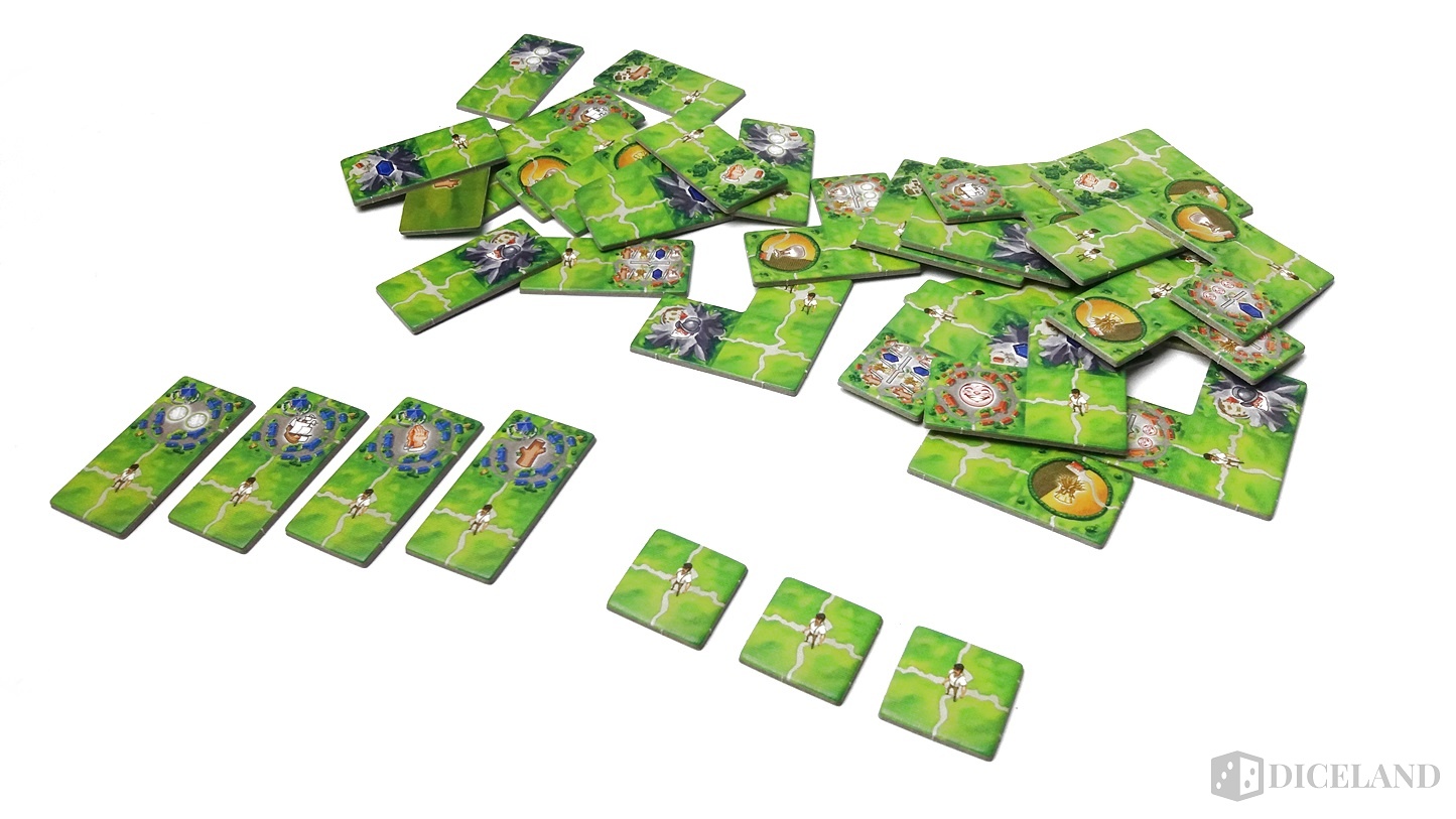 Pozostałe elementy to najróżniejsze kafelki. Począwszy od kafelków biskupów, uczonych, statków, kończąc na nowych terenach. Kafelki terenów posiadają dwa różne kształty: potrójne i podwójne. Znajdziemy na nich nowe osady, plantacje, lasy, góry i inne ciekawe akcje przydatne podczas rozbudowy naszej wspaniałej osady. Ich wykonaniu nie mam nic do zarzucenia, jednak graficznie nie są tak czytelne, jak choćby kafelki z gry „Capital” tego samego wydawnictwa.
