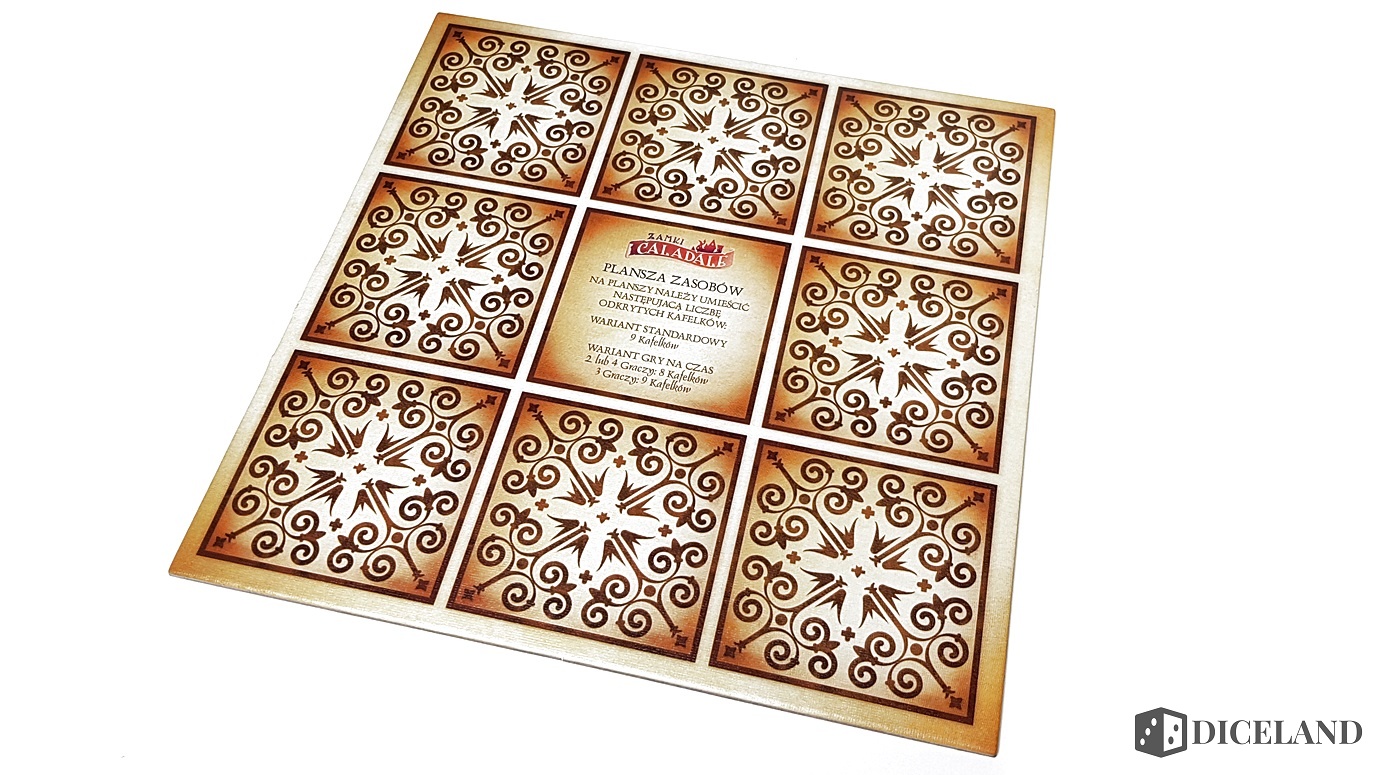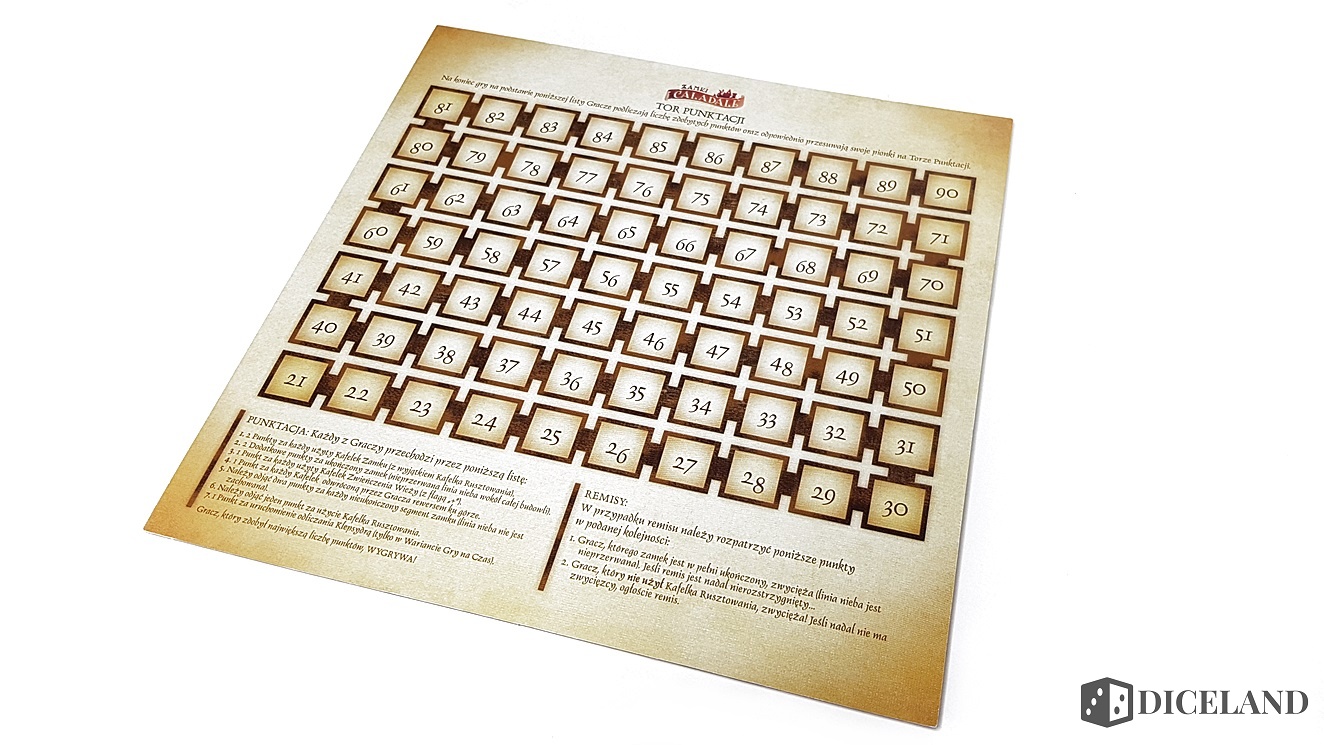 Z tekturowych elementów otrzymujemy również 4 pasy trawy, które spełniają funkcję podstawki pod nasz zamek oraz planszę zasobów. Spełnia ona dwie funkcje, ponieważ podczas rozgrywki wykładamy na nią kafle zamku, natomiast po zakończeniu budowy, stanie się torem punktacji. Zostało to bardzo dobrze przemyślane, ponieważ dzięki temu oszczędzamy na stole miejsce, które będzie niezwykle cenne podczas budowania.