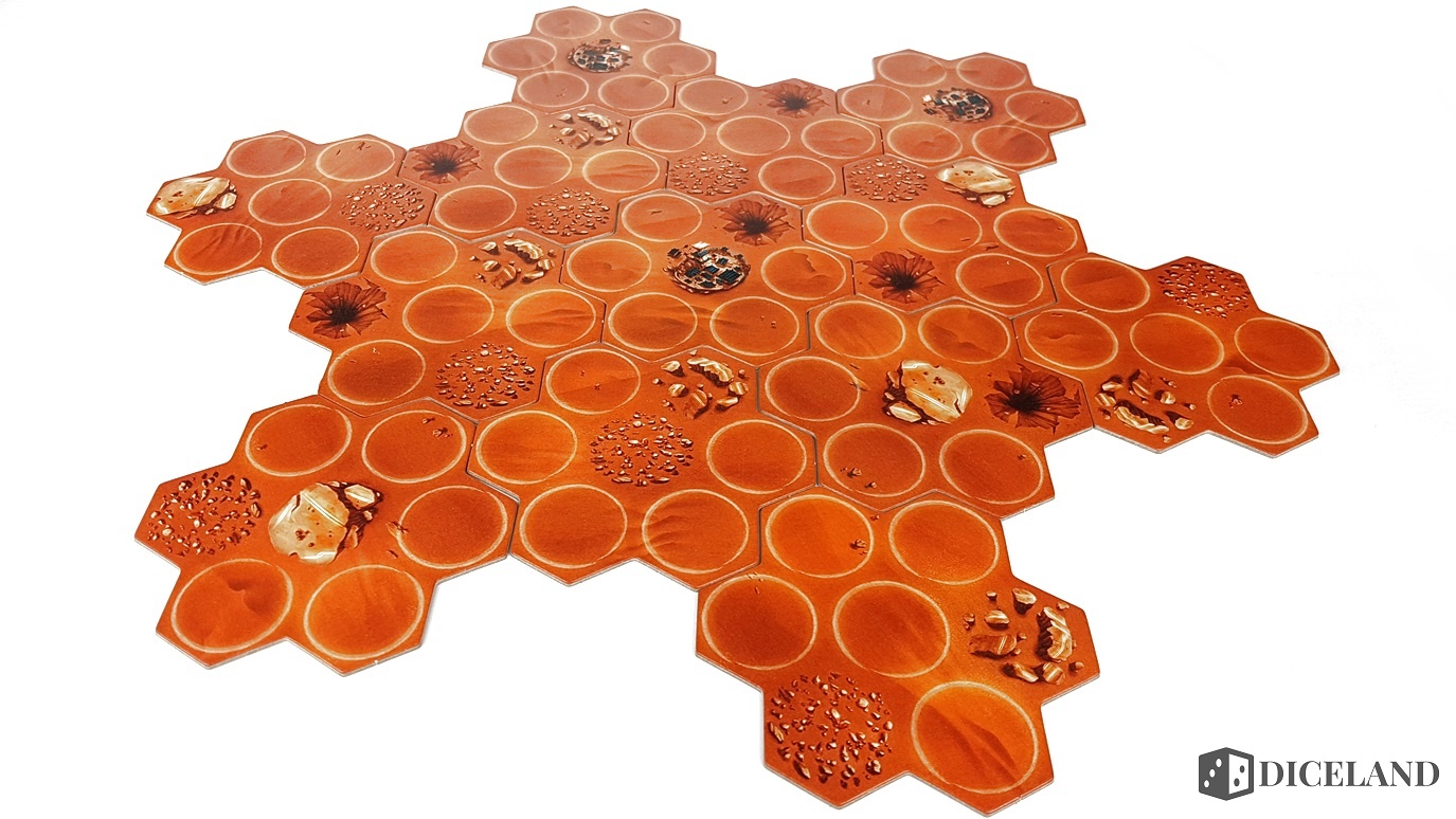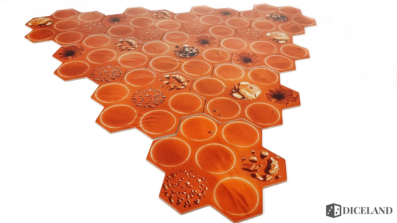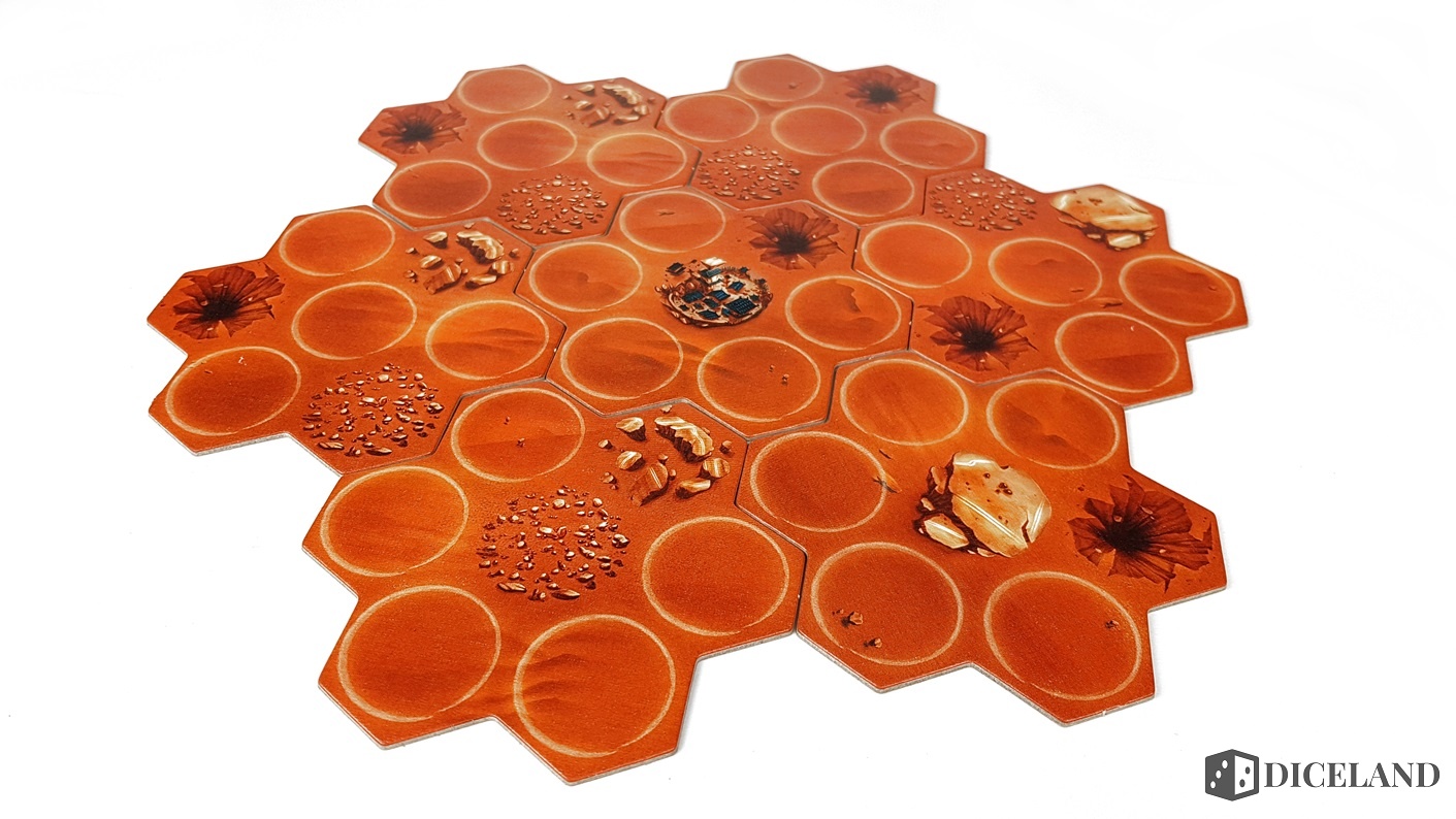 Naszą planszę złożymy z 13 dużych kafli z szarym, niebieskim i czerwonym rewersem, których będziemy używać w zależności od liczby graczy. Dodatkowo mamy do dyspozycji jeszcze 11 małych oraz 3 duże płytki, które przydadzą się w innych wariantach rozgrywki. Jak widzicie możliwości rozbudowy planszy mamy bardzo dużo, co moim zdaniem jest bardzo dobrym rozwiązaniem. Dodatki możemy łączyć ze sobą dobrowolnie, dzięki czemu za każdym razem stworzymy zupełnie inną modularną planszę. Wykonanie kafli jest o niebo lepsze od planszetki gracza, ponieważ tutaj otrzymujemy już kawał grubej tektury odpornej na uszkodzenia.