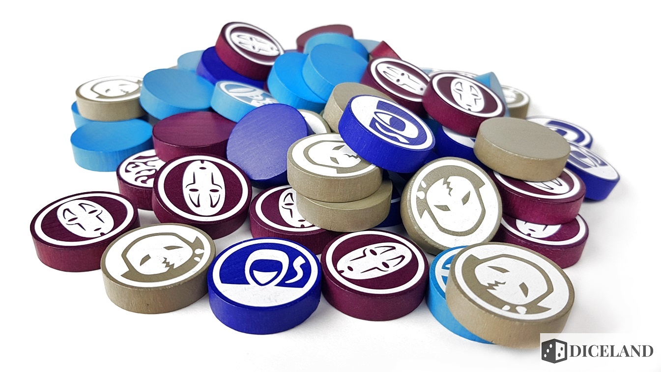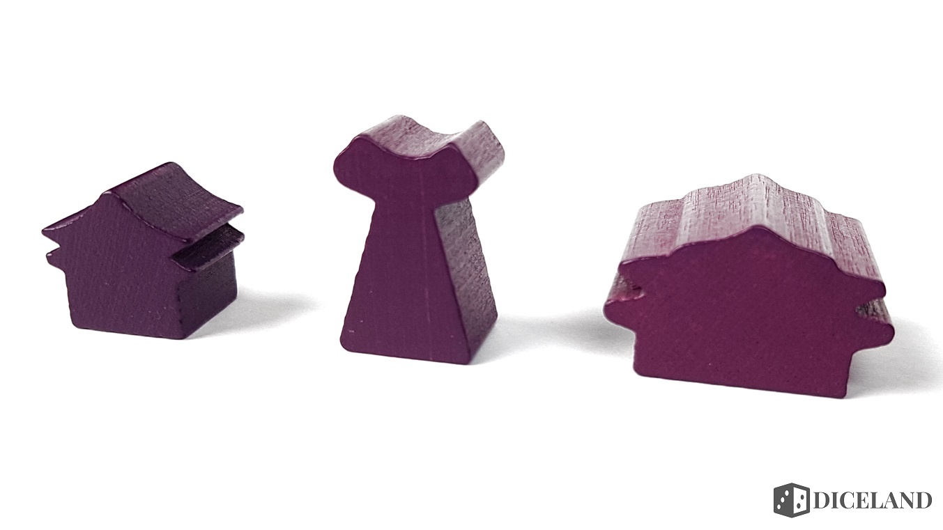 W Eko pionkami są drewniane dyski wojowników w czterech kolorach, których na gracza przypada po 16. Ten element bardzo pozytywnie mnie zaskoczył, ponieważ nie dość, że świetnie się prezentuje, to jeszcze wzór na górze nie jest jedynie zwykłą naklejką. Budynki również zostały wykonane z drewna. Każdy gracz otrzymuje 1 zamek, 3 wieże i 5 obozów w swoim kolorze. Są one w pełni odróżnialne od siebie i także prezentują się bardzo ciekawie.