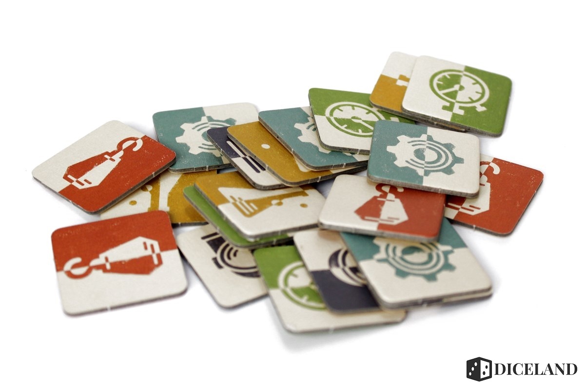 Wraz z grą otrzymamy również żetony badań oraz pierwszego gracza. Oba przedstawiają proste rysunki, czy raczej symbole. Bardzo dobrze komponują się z całością gry i są solidnie wykonane. Oprócz nich otrzymamy też dwuczęściowe organizery naszego ośrodka badawczego. Dzielą one przestrzeń na pięć działów, do których przypiszemy naszych specjalistów. Nie jest to element niezbędny do gry, jednak pomaga nieco bardziej zorganizować pole gry.
