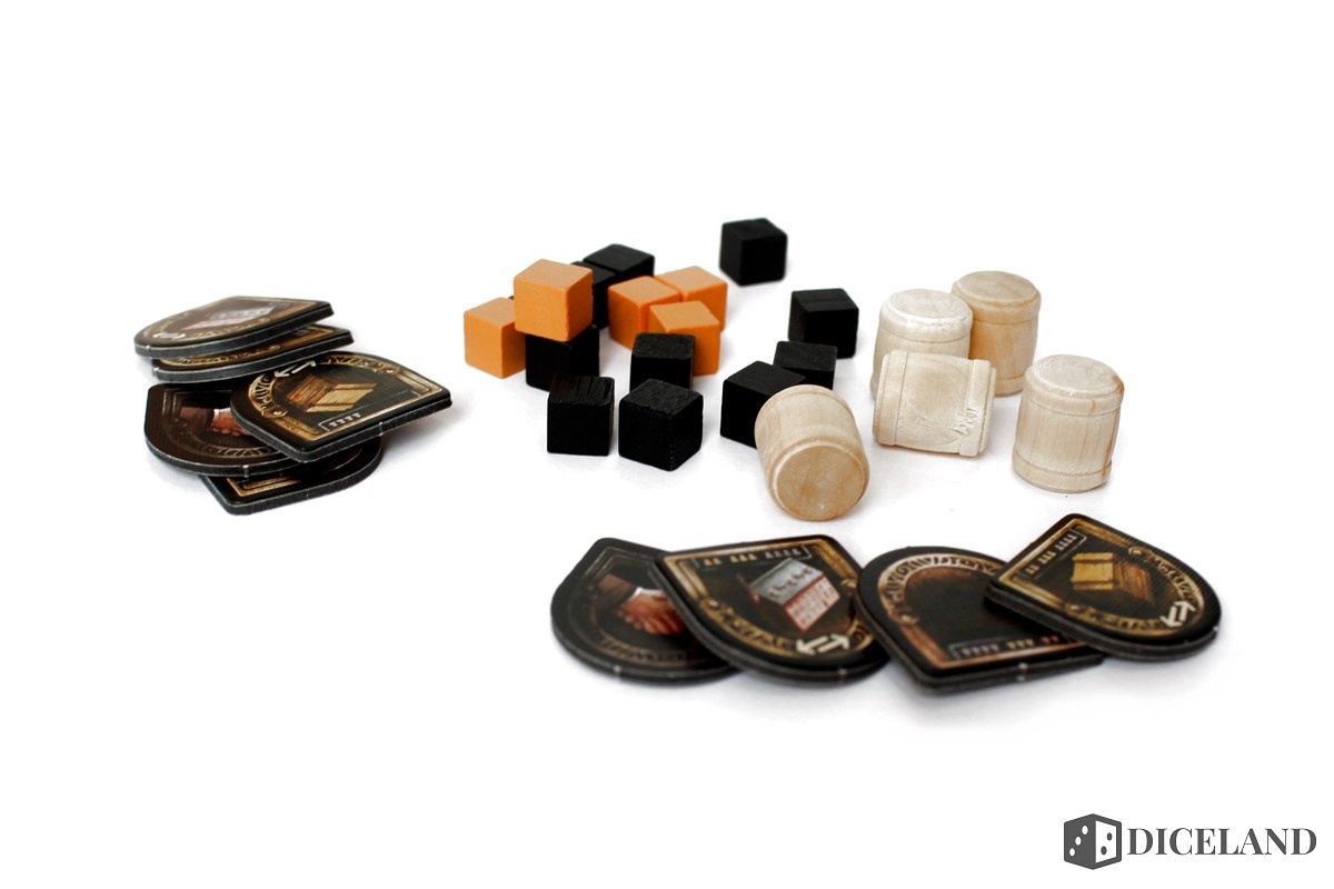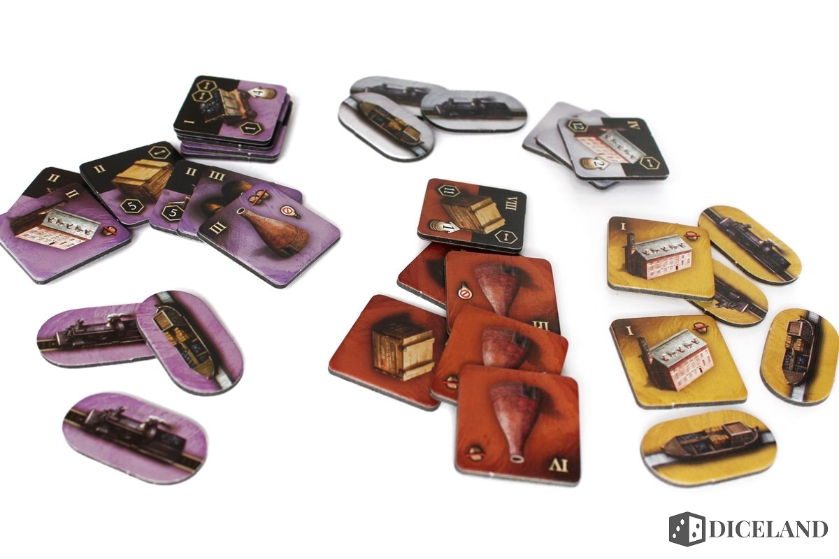 Surowce występujące w grze są reprezentowane przez czarne i pomarańczowe kostki (odpowiednio węgiel i żelazo) oraz nieco bardziej finezyjne drewniane beczki, wprowadzające do świata Brass-a nowy zasób, czyli piwo. Każdy z graczy otrzyma również znaczniki punktów zwycięstwa oraz przychodu, a także żeton służący do określenia kolejności w rundzie.