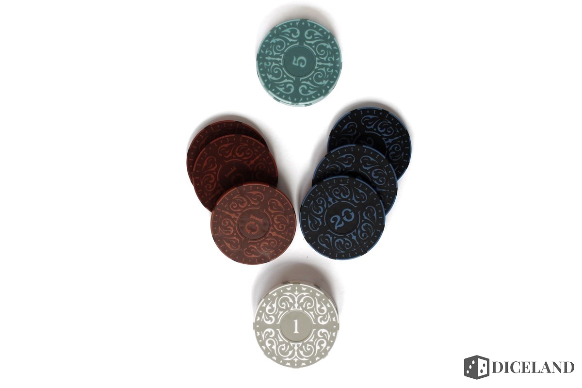 Tym, co rzuci się Wam w oczy najbardziej, są pieniądze. Wykonano je jako pokerowe żetony w różnych kolorach. To naprawdę świetne rozwiązanie! Przede wszystkim wygląda genialnie! Żetony przyjemnie leżą w dłoni, łatwo je przechowywać w zorganizowany sposób, no i ten dźwięk! Można spierać się czy w grach to właśnie najlepsze rozwiązanie, czy też więcej klimatu dają monety metalowe. Tak czy owak zastąpienie zwykłych kartonowych elementów jest zawsze wartością dodaną.