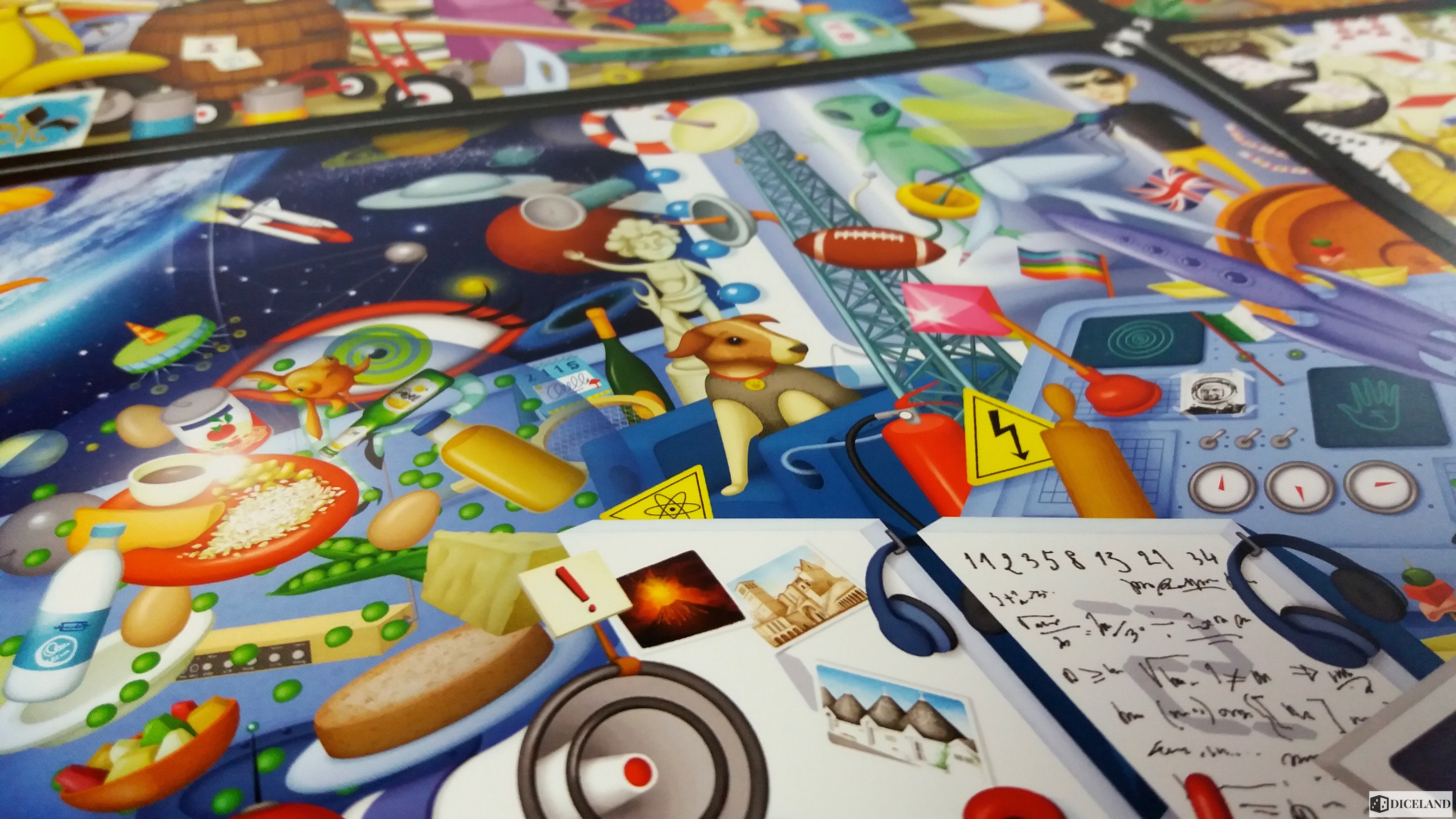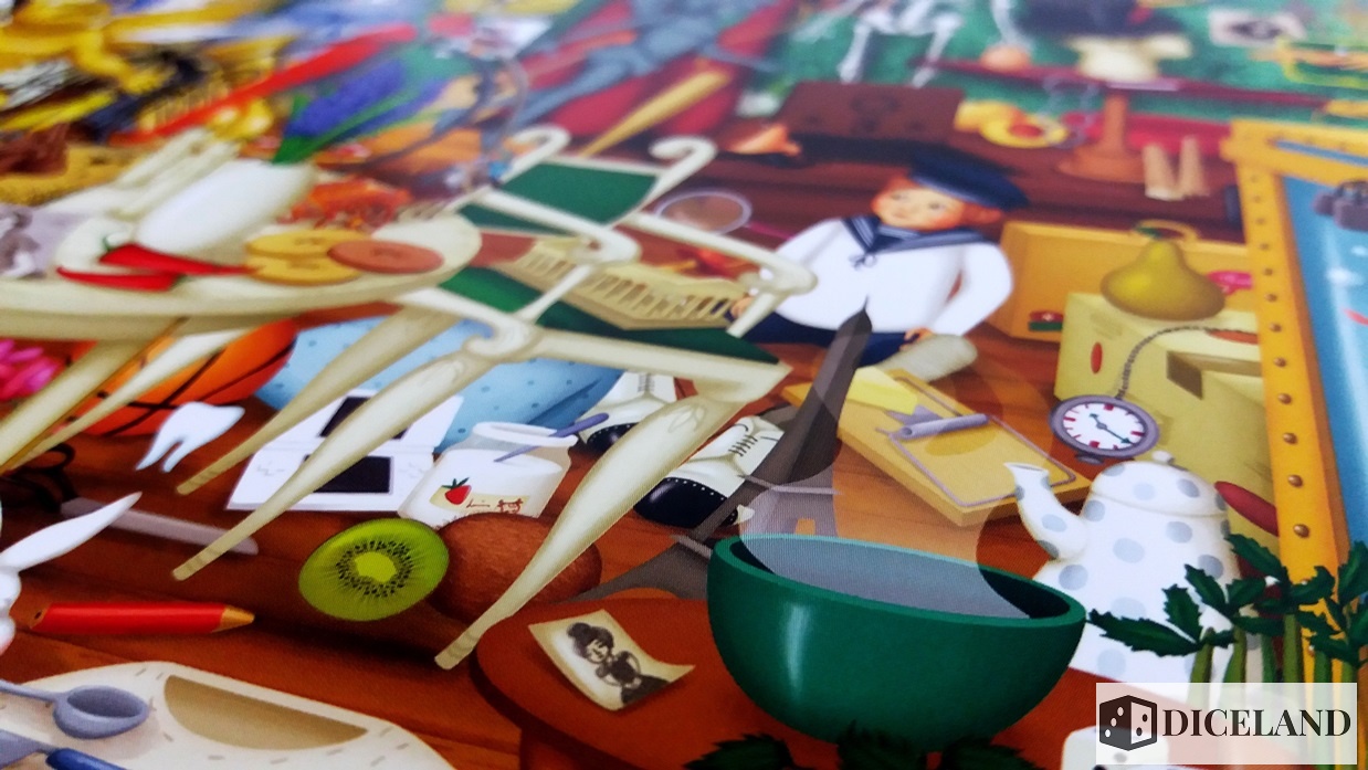 W jego wnętrzu znajdziemy bardzo krótką i zwięzłą instrukcję. Wystarczy zaledwie kilka minut i już wiemy jak grać. Największe wrażenie zrobiło na mnie natomiast 20 dwustronnie ilustrowanych plansz. Znajdziemy na nich aż 10 niezwykłych kompozycji. Każda z ilustracji nawiązuje tematycznie do innych sytuacji, ale łączy je jedna cecha wspólna… bałagan. W tym chaosie jest jednak coś pięknego, co nie sposób opisać. Zresztą przyjrzyjcie się im sami.