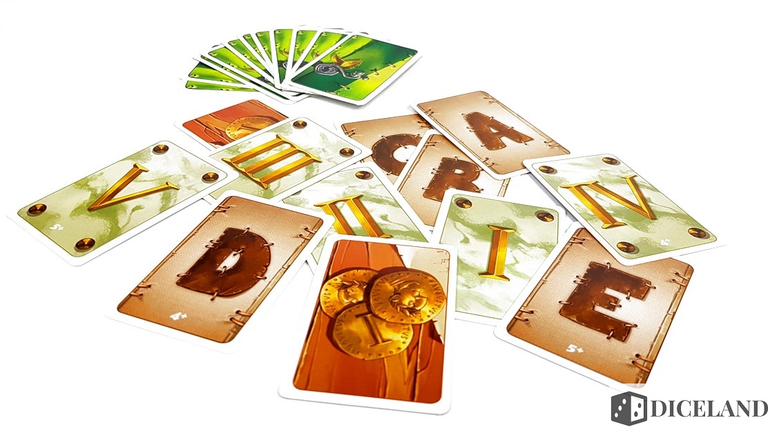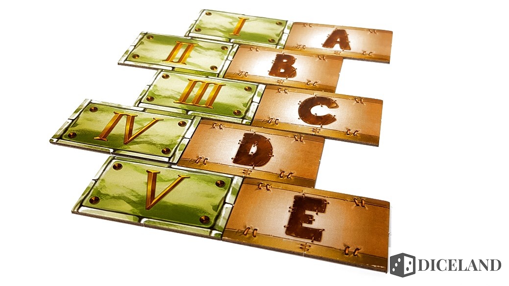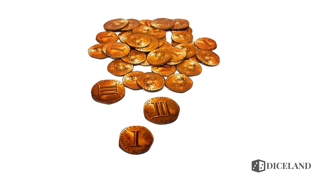 Nie zabrakło również tekturowych znaczników z literami oraz liczbami takimi samymi jak na kartach. Podoba mi się to, że są niesamowicie solidne. W grze będziemy wykorzystywać również monety – sestercje, które również wywołały u mnie pozytywne zaskoczenie. Nie jest to kawałek tektury o kształcie koła! Zamiast tego otrzymujemy porządne monetki i choć nadal są one tekturowe, to ich nieregularny kształt sprawia, że wyglądają bardziej realistycznie.