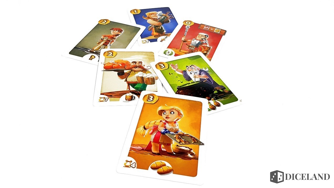 Najwięcej jest tutaj oczywiście kart i to aż w dwóch, różnych rozmiarach. Na większych znajdziemy miejsca oraz postacie do zdobycia. Każda z nich zawiera koszt zakupu oraz korzyści, jakie uzyskamy. Karty są bardzo przejrzyste, a symbole łatwe do zrozumienia. Bardzo spodobały mi się również grafiki, utrzymane w lekko komiksowym stylu. Natomiast małe karty dzielą się na 5 kolorów, czyli po jednym zestawie dla każdego gracza. Znajdują się na nich oznaczenia liter i liczb oraz symbole monetek.