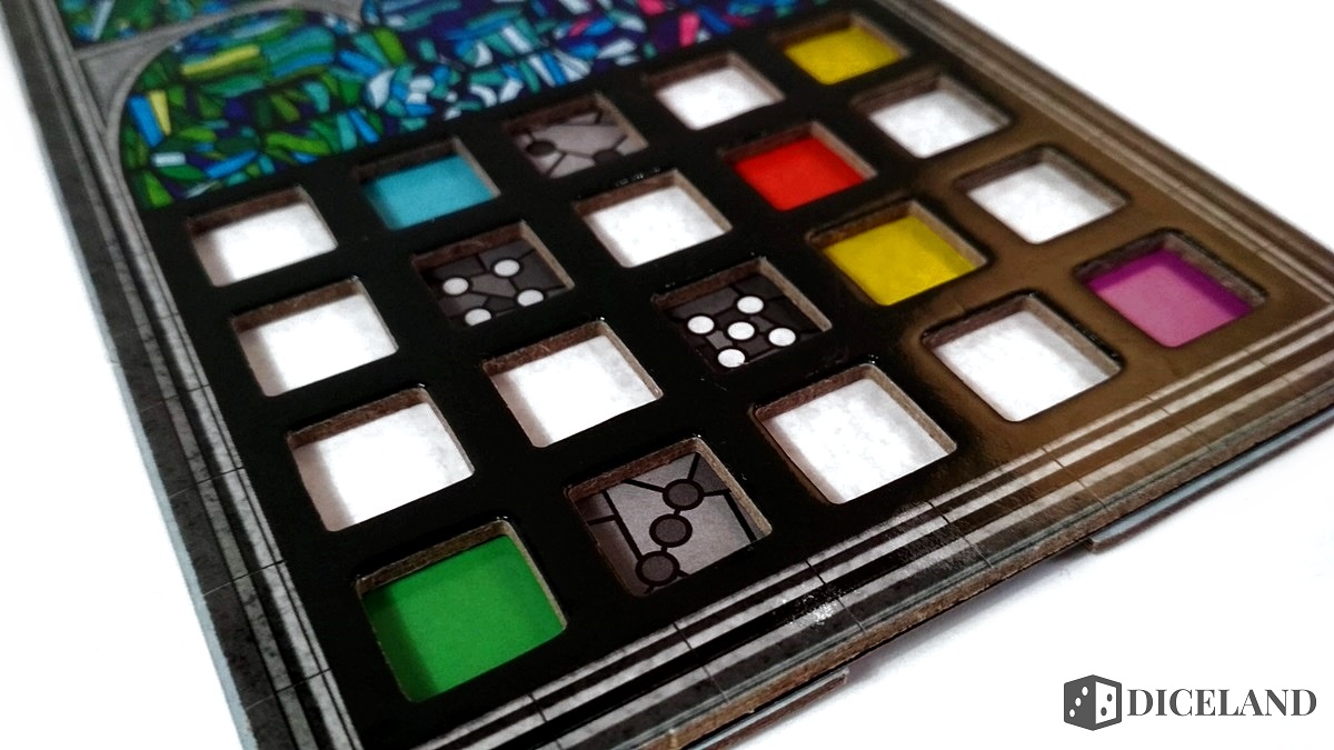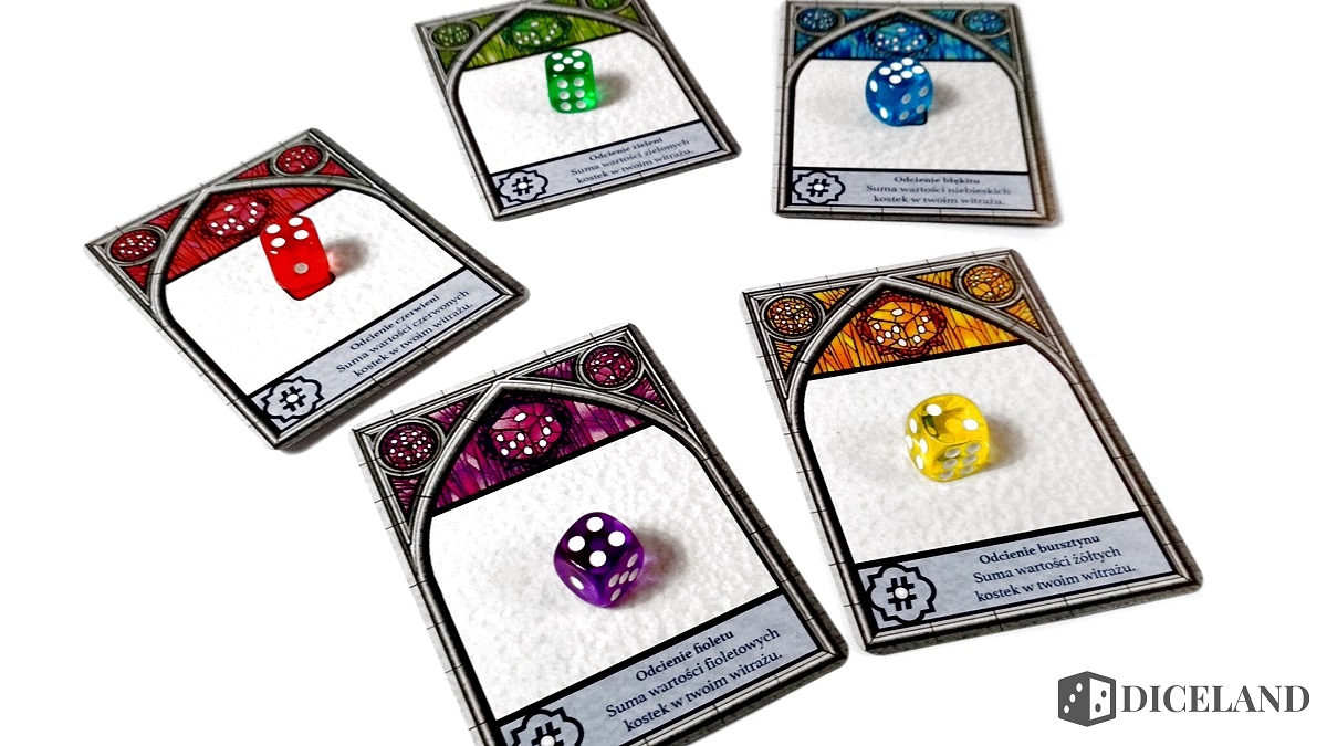 Mechanikę gry oparto tylko i wyłącznie na kościach i sposobie ich ułożenia na naszym witrażu. Musimy zwracać szczególną uwagę na nasz indywidualny cel, gdyż dzięki niemu możemy bardzo dużo zyskać. Jeśli losowość nie będzie po naszej stronie i kości w naszym kolorze będą miały bardzo niskie wartości albo co gorsza, nie pojawią się w ogóle, może okazać się, że niezależnie od naszych starań, po prostu przegramy. Może to rodzić frustrację u niektórych. Mnie to w ogóle nie przeszkadzało. Jeśli jednak jesteś zwolennikiem większej kontroli i strategii, to zawsze możesz zastosować domowe zasady i wtedy każda taka kość w kolorze wskazanym na karcie celu indywidualne może być warta np. 3 punkty. Wtedy sprawiedliwości stanie się zadość.